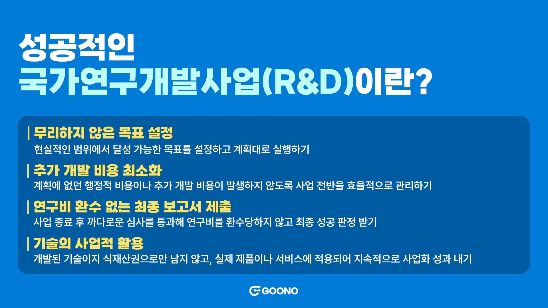 단순히 사업계획서를 잘 작성해서 합격하는 것만이 R&D 사업의 성공은 아닙니다. 진짜 성공은 다음과 같은 것들을 모두 이뤄냈을 때라고 할 수 있어요. |