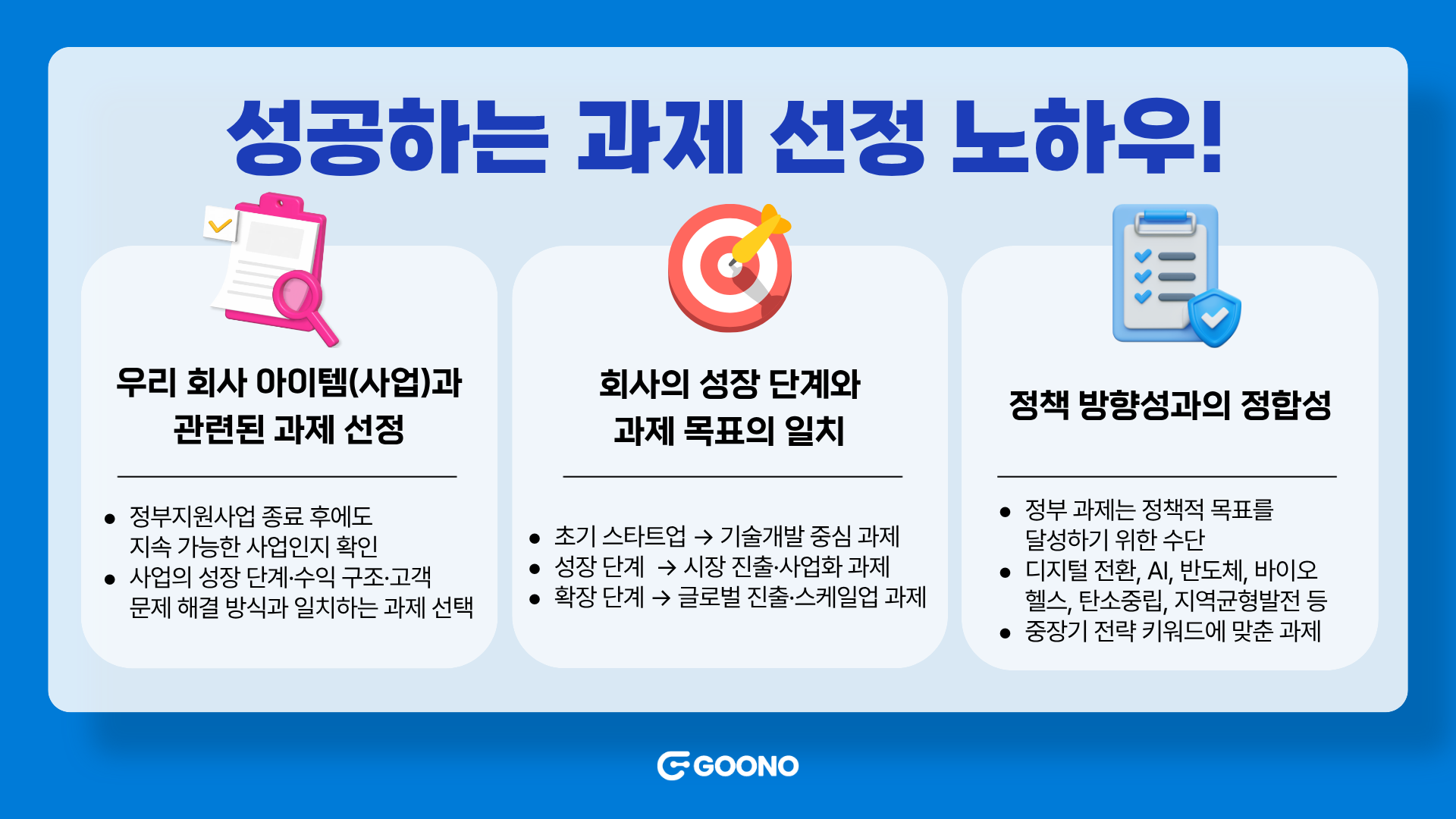 좋은 아이디어가 있어도 어떤 과제를 선택하느냐에 따라 사업의 성패가 갈릴 수 있습니다. 정부 R&D 과제는 단순한 자금 지원을 넘어, 우리 사업의 방향성을 결정짓는 중요한 기회이죠. 이제부터 여러분의 비즈니스를 한 단계 더 성장시킬 수 있는, 성공하는 과제 선정의 핵심 노하우를 함께 살펴보겠습니다. |
