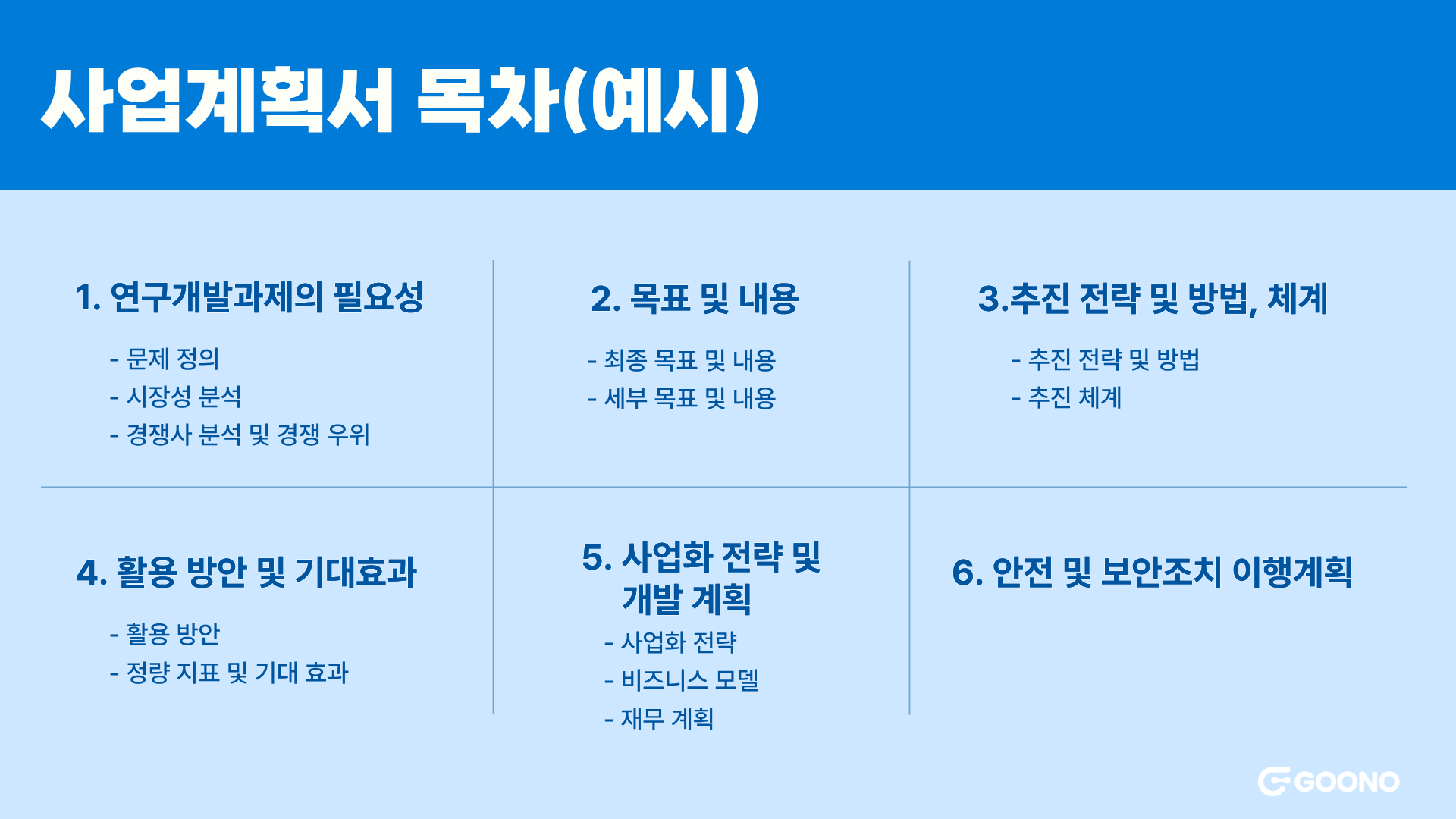 - 추진 전략 및 방법: 연구개발을 어떻게 진행할지 구체적인 방법론을 제시합니다.