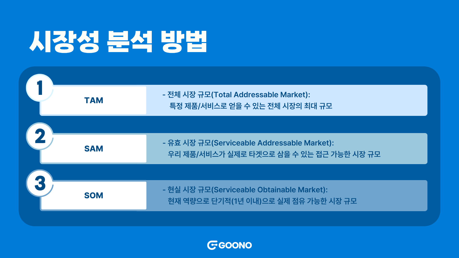 - 시장성 분석: 우리 아이템이 진출할 시장의 규모를 TAM, SAM, SOM 개념을 활용해 보여줍니다. 시장의 잠재력과 현실적인 목표를 제시하여 투자자에게 신뢰감을 줄 수 있습니다.