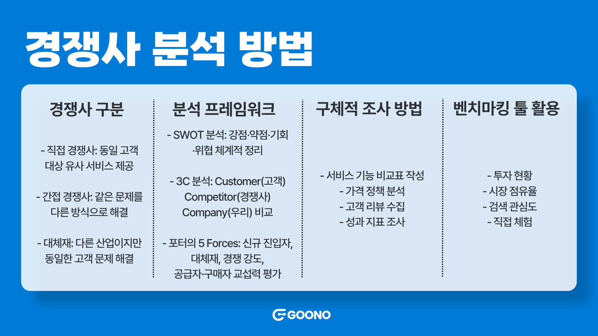 경쟁사 분석은 단순히 우리와 비슷한 서비스를 제공하고 있는 기업을 확인하는 것이 아니라, 분석을 통해 우리 사업의 차별성과 경쟁 우위를 드러내는 핵심 과정입니다. |