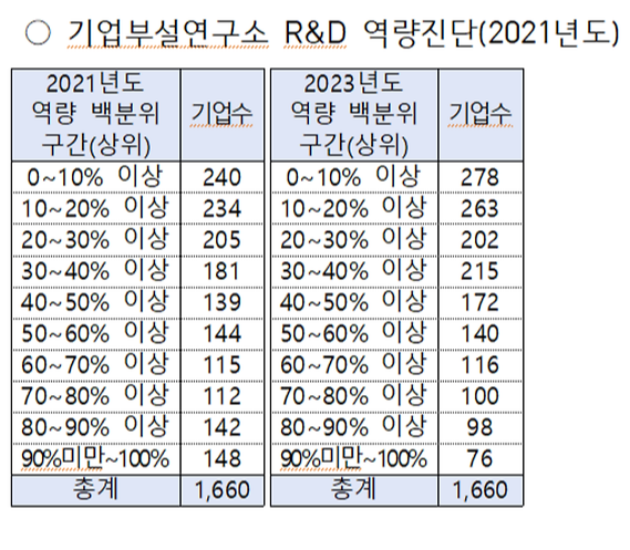 중소벤처기업부의 R&D 지원을 받은 기업들의 기술 역량이 최근 3년간 크게 향상된 것으로 나타났다. 2021년 지원사업 선정 기업 중 역량평가 상위 10%에 속한 기업은 240곳에서 2023년 278곳으로 16% 증가했고, 하위 20% 기업은 290곳에서 174곳으로 40% 줄었다.