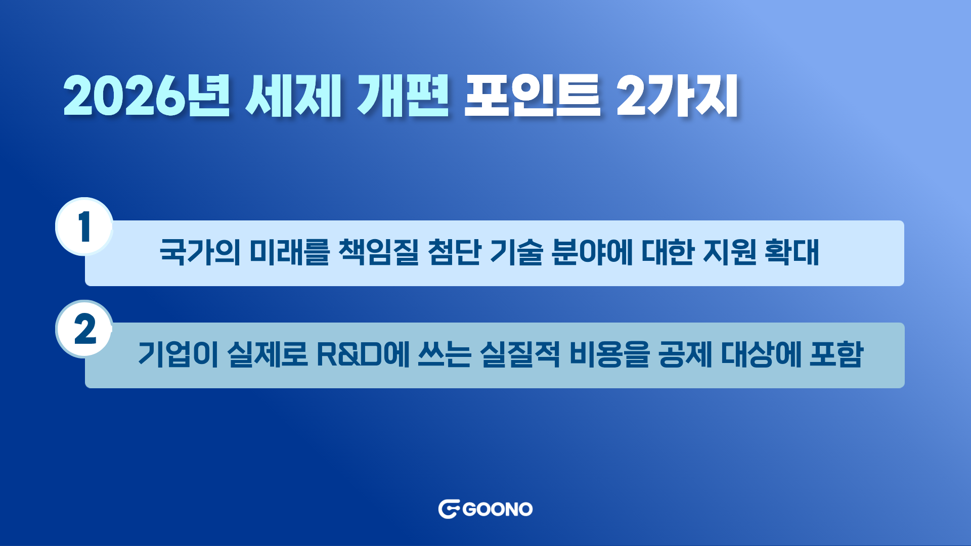 매년 달라지는 세제 혜택들, 일일히 확인하기 어려우실 구독자 여러분들을 위해서 구노레터가 주요 변경 사항을 한눈에 볼 수 있도록 깔끔하게 정리했습니다. 불확실한 시대일수록 R&D 투자는 더욱 중요해진다는 사실 다들 알고 계실 텐데요! 2026년부터 확 달라지는 혜택을 꼼꼼히 확인해서 우리 회사의 성장을 위한 기반을 튼튼히 다져보세요. |