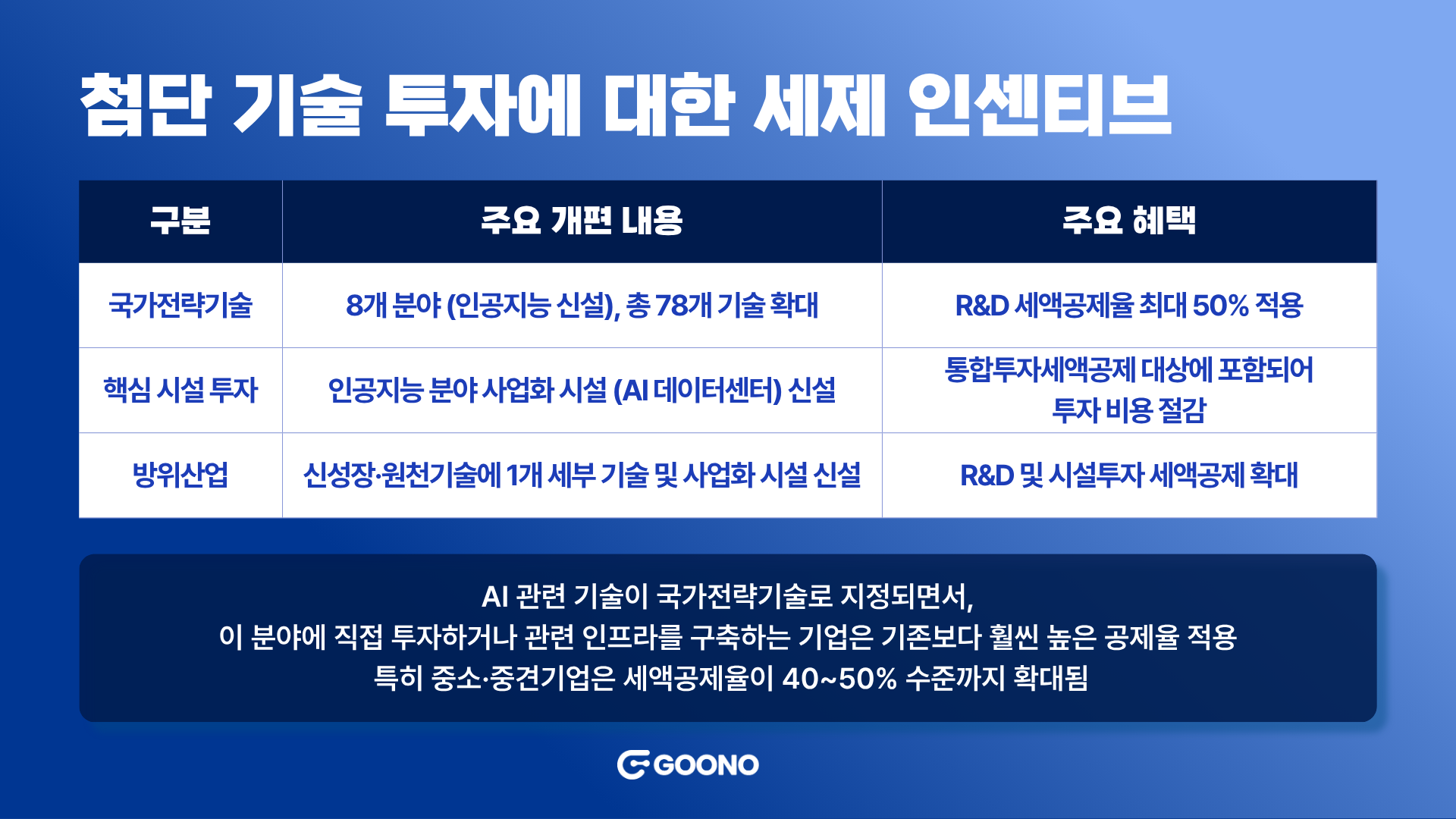 하지만 이후 미·중 기술 패권 경쟁 심화, 공급망 재편, 첨단산업의 국가 안보적 가치 부각 등 글로벌 환경 변화에 대응하기 위해, 정부는 ‘신성장·원천기술’에 이어 ‘국가전략기술’이라는 새로운 범주를 신설했습니다. 반도체, 배터리, AI, 우주항공 등 국가 경쟁력을 좌우할 핵심 분야에 대해 최대 30~50%의 세액공제율을 적용하며 지원 강도를 크게 높였습니다.