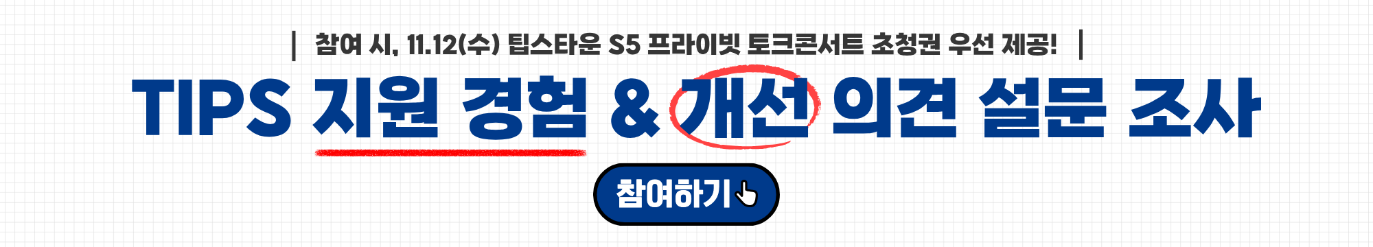 🕓 소요시간: 약 8분 👥 대상: TIPS 예비창업자, 수행·졸업 기업 💬 설문 참여자 중 ‘토크콘서트 참석’ 선택 시, 11.12(수) 팁스타운 S5 프라이빗 토크콘서트 초청권을 우선 제공합니다. (선배 TIPS 합격자료 및 R&D 솔루션 현장 제공 예정)