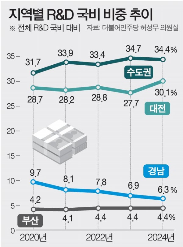 정부의 연구개발(R&D) 국비 지원이 수도권과 대전에 집중되고 있는 것으로 나타났다. 지난해 전체 R&D 국비 25조3278억 원 중 수도권(서울·경기·인천)이 34.4%, 대전이 30.1%를 차지해 두 지역에 전체의 64.5%가 몰렸다. 반면 비수도권 13개 시·도 중 경남이 6.3%, 부산이 4.4%로 그나마 높은 편이었으나, 대부분 지역은 3~4% 수준에 그쳤다.