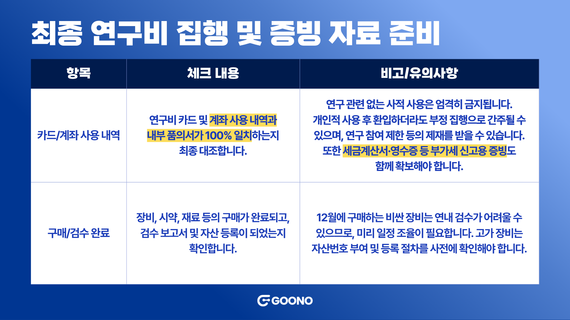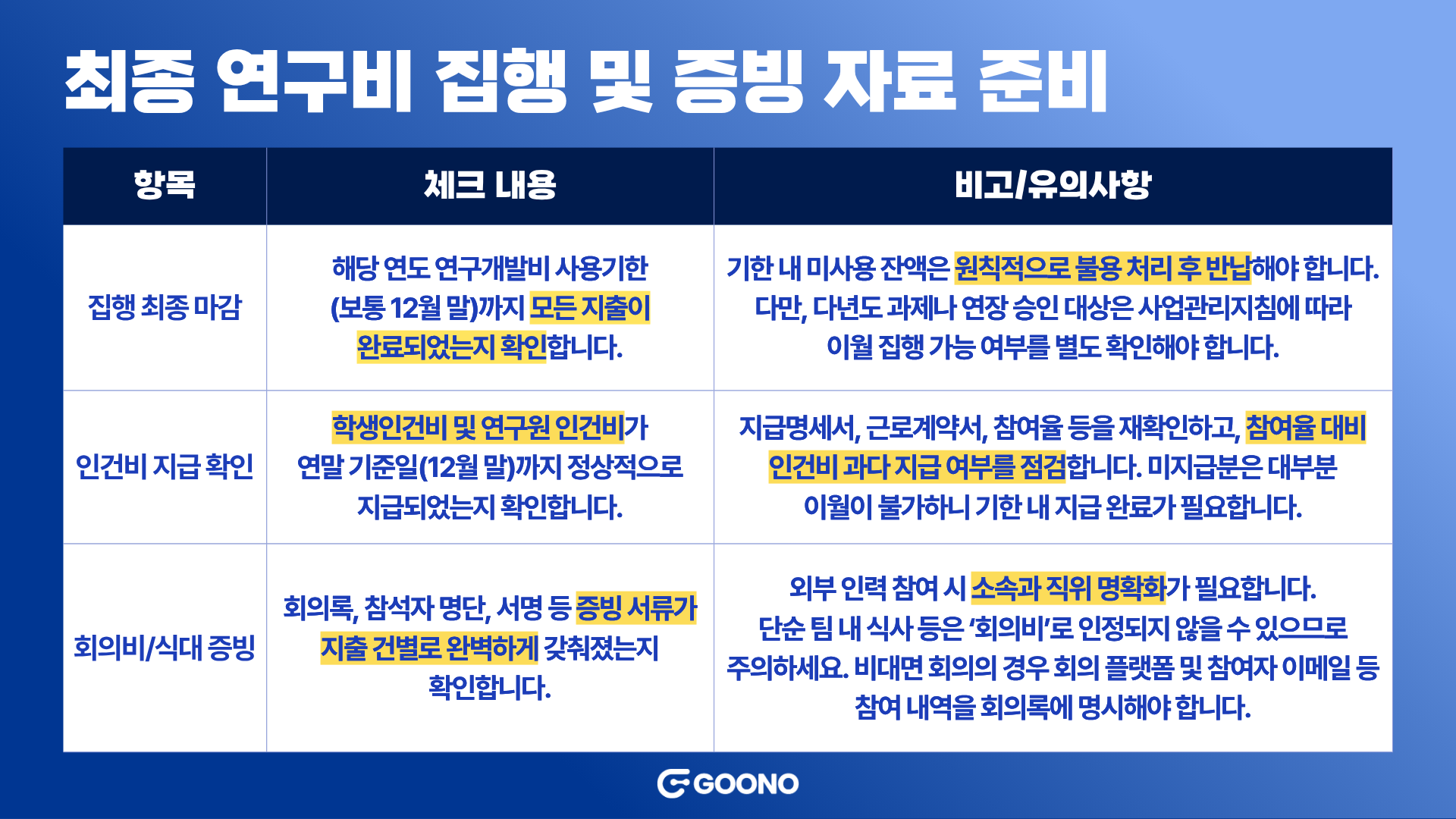 가장 민감한 연구비 집행! 모든 지출을 마감하고, 남은 잔액을 규정에 맞게 처리하는 것이 핵심이랍니다. 연구비는 공적 자산인 만큼 규정 준수와 투명한 기록이 필수입니다. 빈틈없는 정산을 위해서는 지출 완료 시점까지 기다리지 말고, 지금부터 증빙 서류를 꼼꼼히 대조하며 누락을 방지해야 합니다.