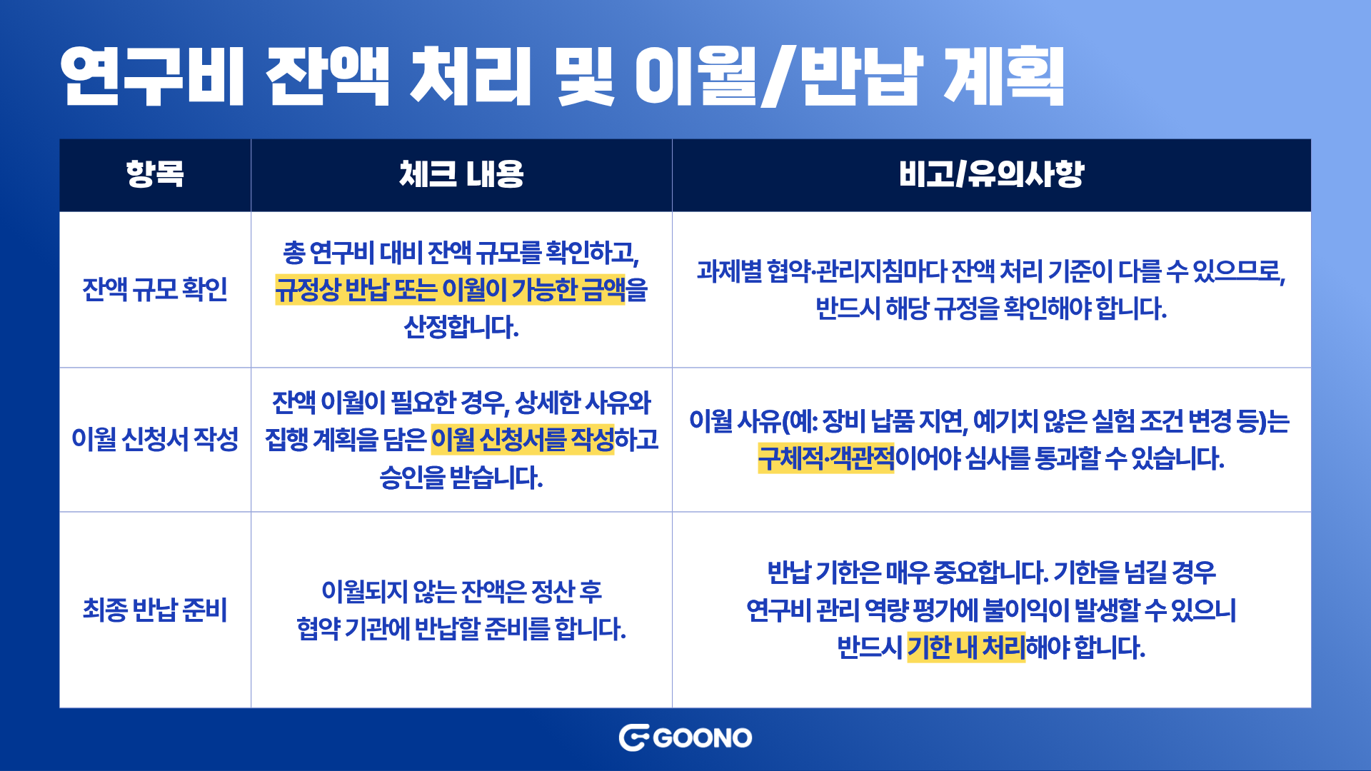 연구 기간 내에 집행하지 못한 잔액은 규정에 따라 처리해야 합니다. 잔액을 투명하고 계획적으로 처리하는 모습이야말로 우리 연구팀의 행정 능력을 보여주는 증거랍니다. 사용하지 못한 예산에 대해 무작정 반납하기보다는, 규정에 따른 이월 가능 여부를 따져서 다음 연구를 위한 계획을 세우는 것이 중요합니다. |