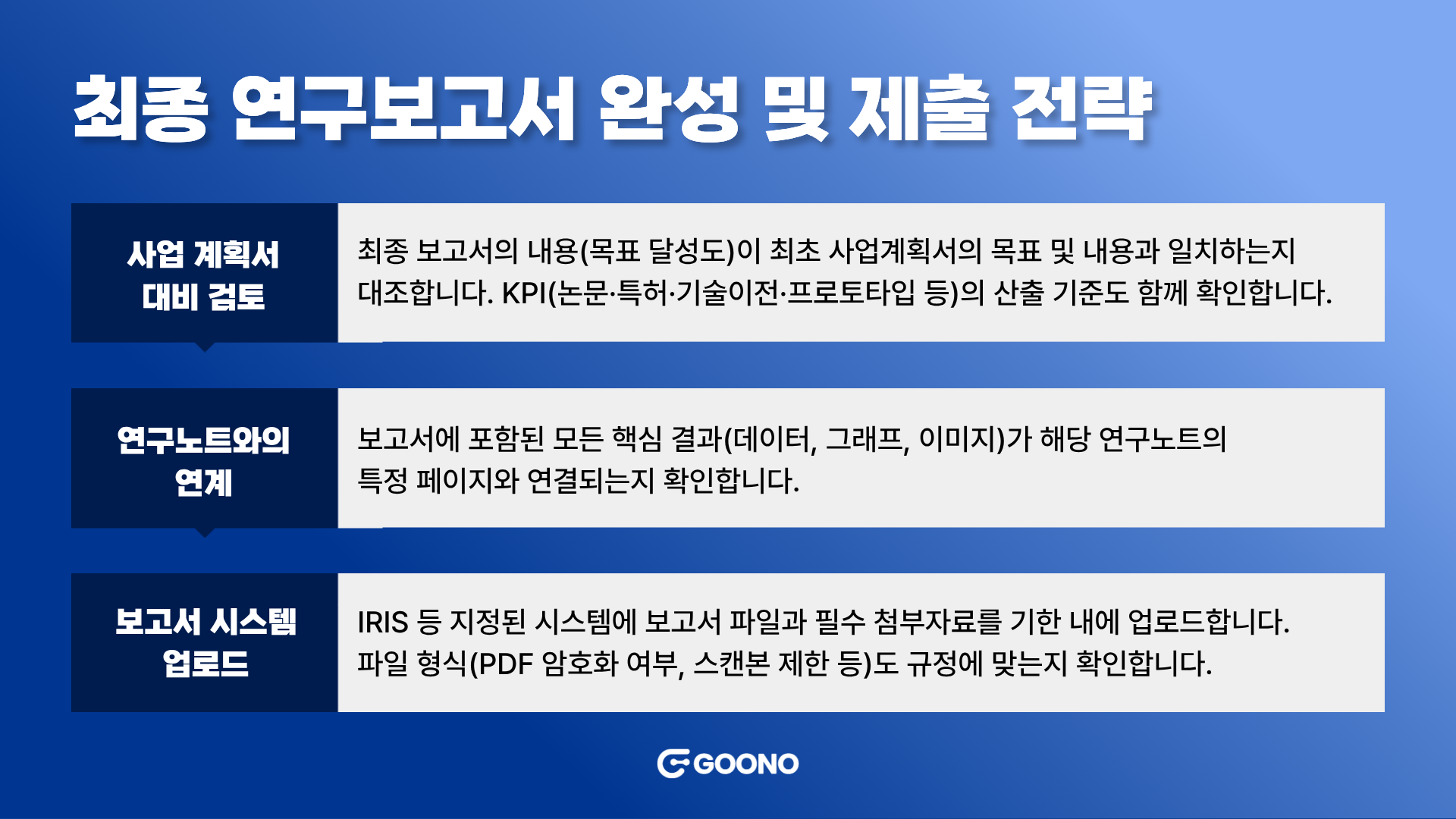 최종 연구보고서는 한 해 동안의 연구 목표 달성 여부를 평가받는 공식 문서입니다. 보고서 작성 시 가장 중요한 건 처음에 약속했던 사업 계획서와의 내용이 잘 맞는지 확인하는 것이에요. 평가자에게 신뢰를 주기 위해서는 연구 과정의 투명성과 결과의 진본성을 보여주는 것이 핵심입니다. 연구노트와의 연계를 통해 보고서의 완성도를 높이는 전략을 꼭 활용해 보세요. |
