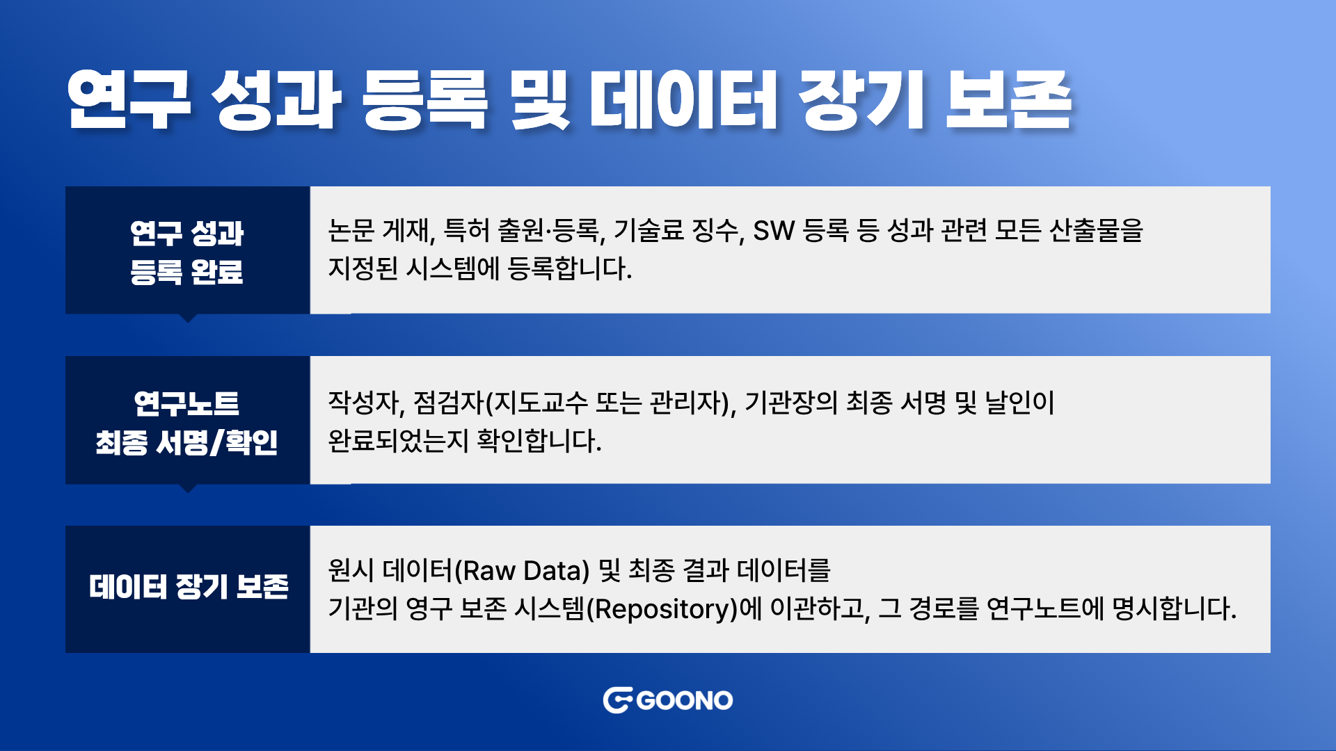 - 서명/승인 기록은 연구 종료를 공식적으로 인정받는 가장 중요한 증거입니다 - 연구노트는 이후 성과 검증, 특허 분쟁, 감사 시 핵심 근거가 되므로 반드시 원본 보존 상태도 점검하세요.