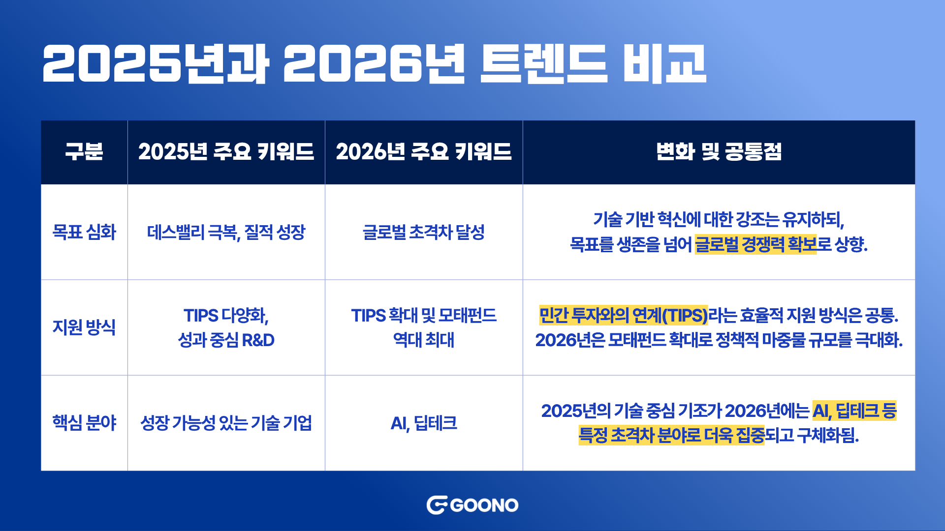 2025년과 2026년의 정부지원사업의 트렌드가 비슷한 듯 하면서도 조금 다른데요. 2025년이 '데스밸리 극복'을 위한 기반 다지기였다면, 2026년은 '초격차 글로벌 도약'이라는 더 확장된 목표를 향하고 있습니다.