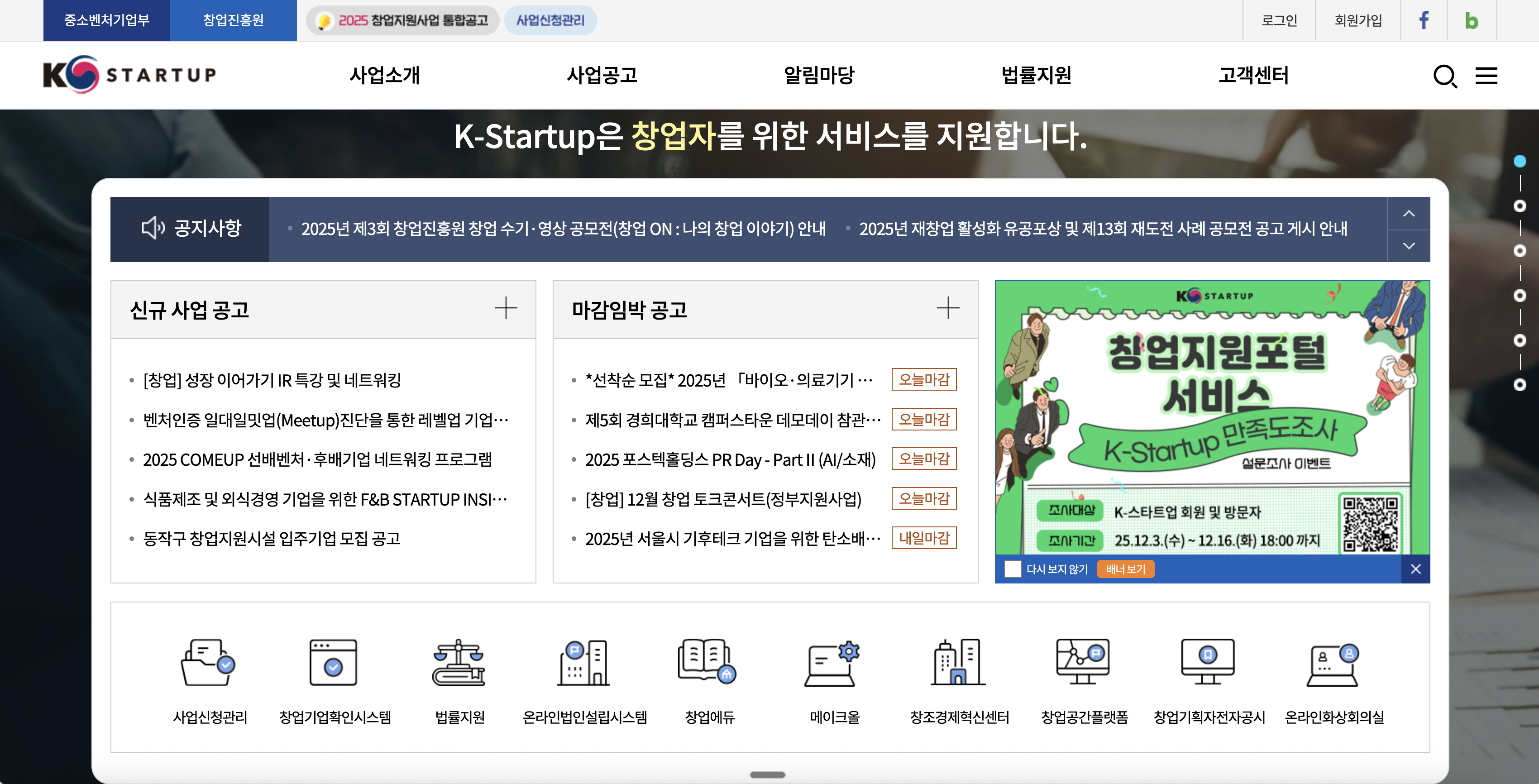 중소벤처기업부 산하 창업진흥원이 운영하는 창업지원사업 통합 플랫폼입니다. 예비창업패키지, 초기창업패키지 등 창업 단계별 핵심 지원 사업의 공고 및 신청을 이곳에서 진행합니다. 또한, 예비창업자를 위한 특강, 교육 및 전문 멘토링 프로그램 신청 등 비자금 지원 정보도 확인할 수 있습니다. 매년 초에 발표되는 중앙부처 및 지자체 창업지원사업 통합 공고 원본을 제공합니다. |