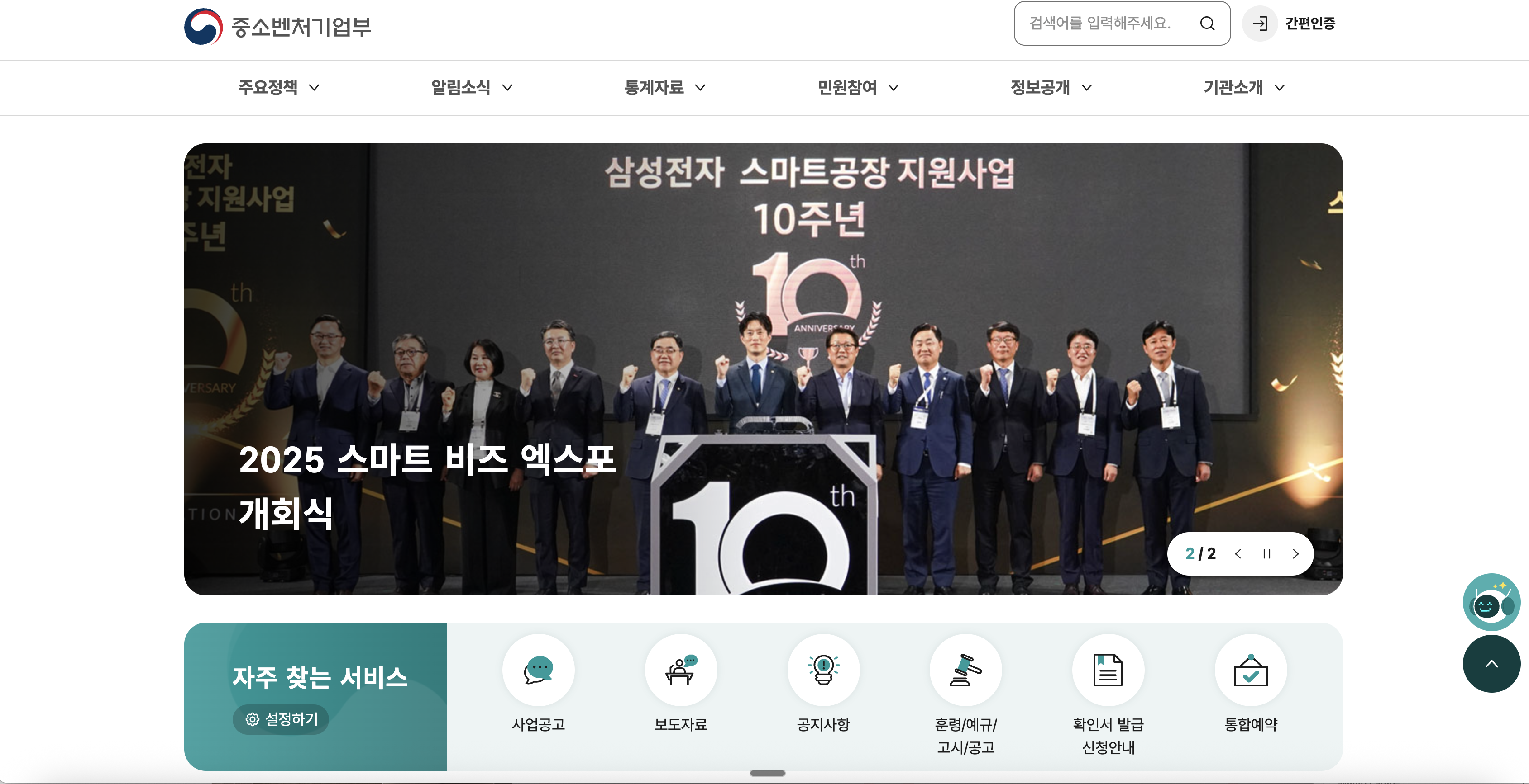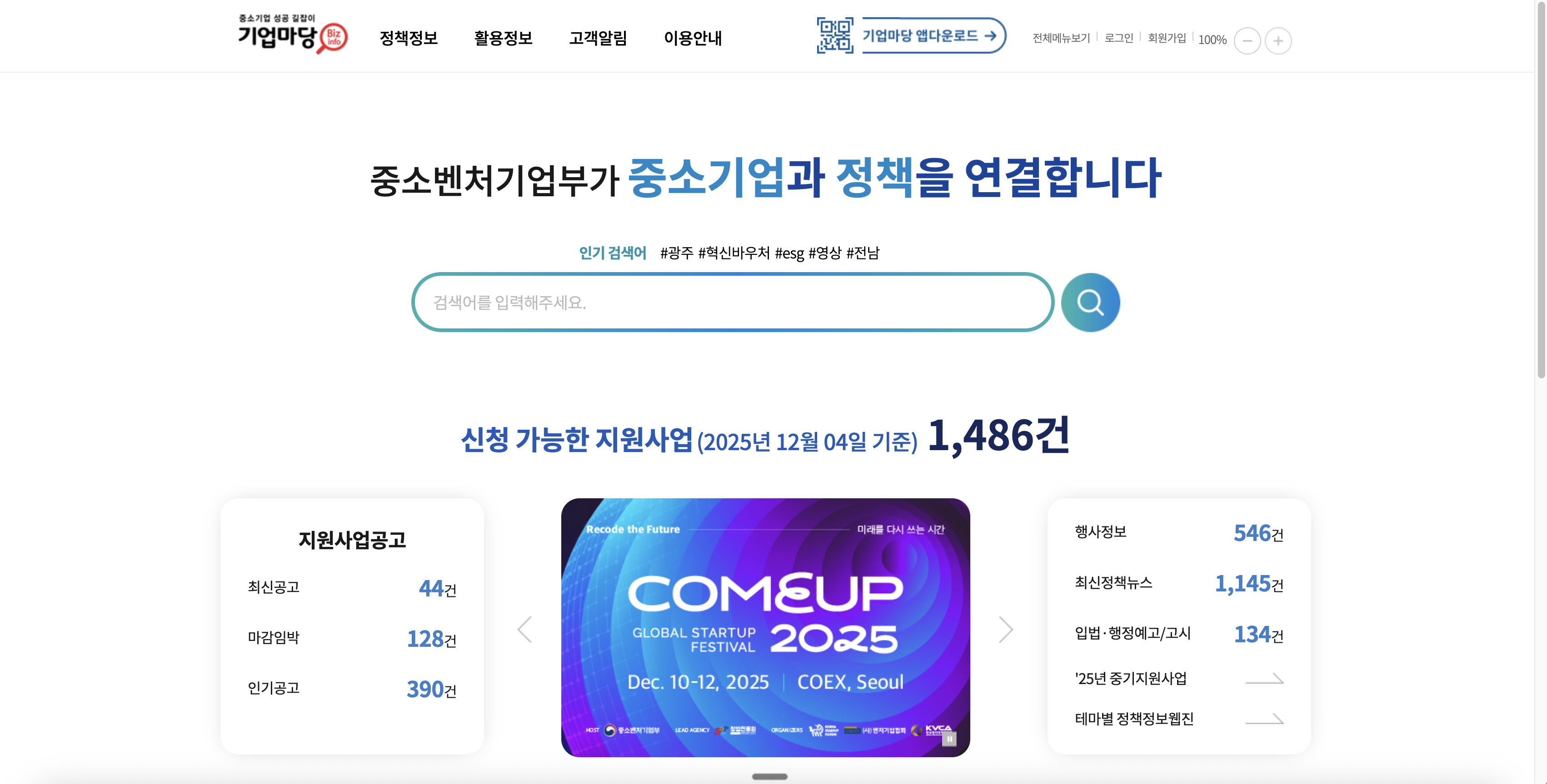 중소벤처기업부에서 운영하는 중소기업/소상공인 지원사업 통합 공고 플랫폼입니다. K-Startup이 창업 단계에 초점을 맞췄다면, 기업마당은 창업 초기부터 성장 단계까지 모든 종류의 중소기업 지원을 포괄합니다. (예: 정책자금 융자, 수출 지원 등) 특히, 중소기업 혁신바우처, 인력 채용 지원, ESG 경영 도입 지원 등 비금융 분야 공고도 폭넓게 제공합니다. |