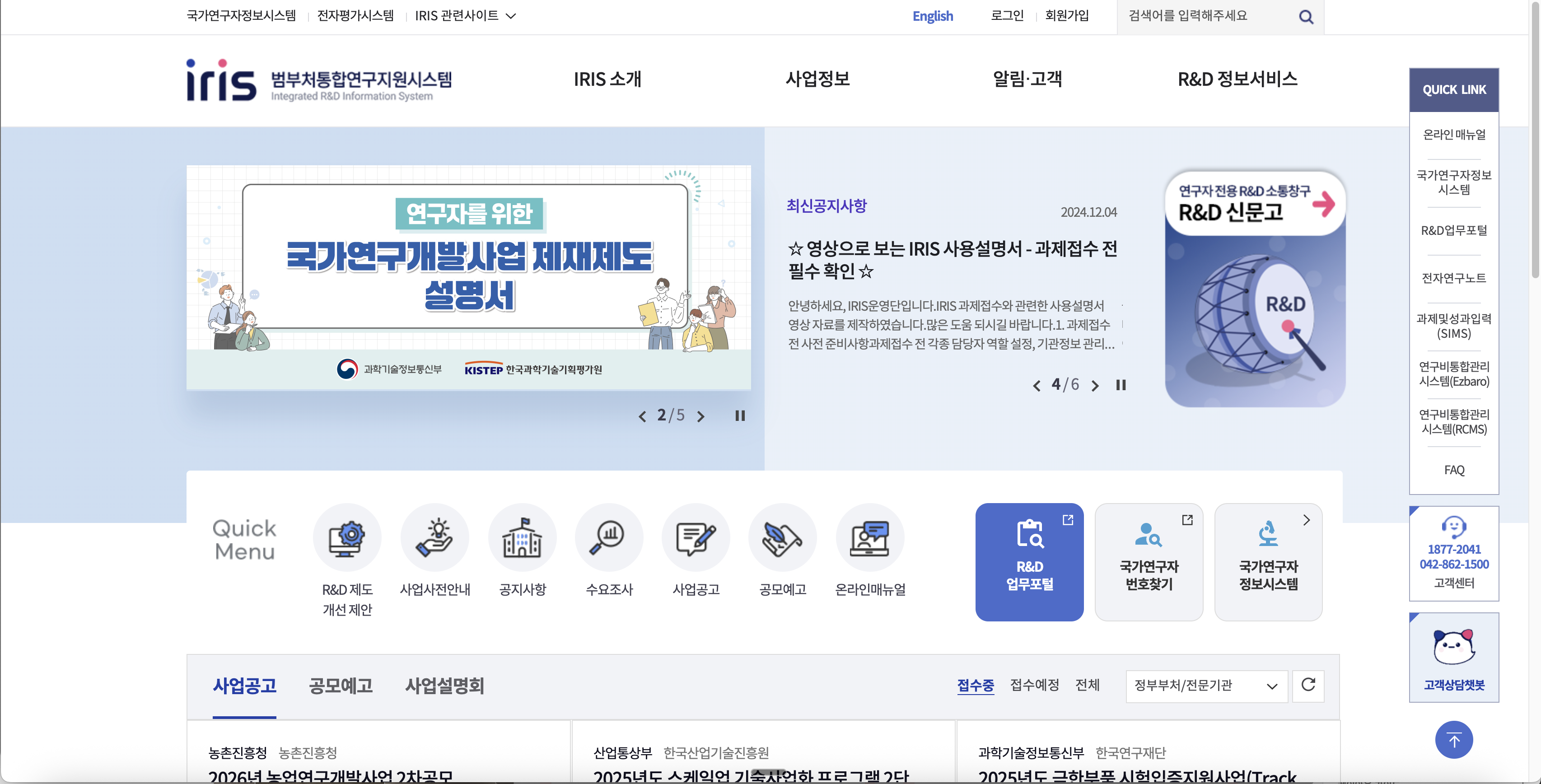 국가 연구개발(R&D) 사업의 정보를 통합 제공하는 시스템입니다. 창업지원사업의 R&D 연계 과제나, 과학기술정보통신부, 산업통상자원부 등 타 부처 주관의 기술 개발 사업 공고를 찾아볼 수 있습니다. R&D 과제별 진행 상황 및 결과, 연구자 정보 등을 통해 협력 파트너를 모색하거나 기술 동향을 파악하는 데 유용합니다. |