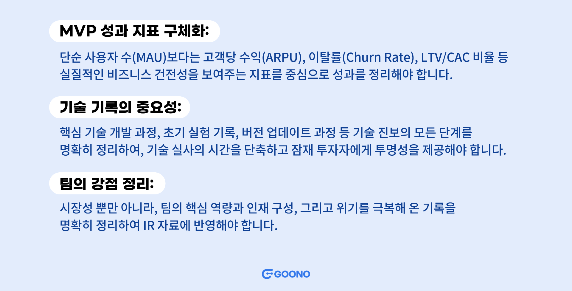 - MVP 성과 지표 구체화: 단순 사용자 수(MAU)보다는 고객당 수익(ARPU), 이탈률(Churn Rate), LTV/CAC 비율 등 실질적인 비즈니스 건전성을 보여주는 지표를 중심으로 성과를 정리해야 합니다.