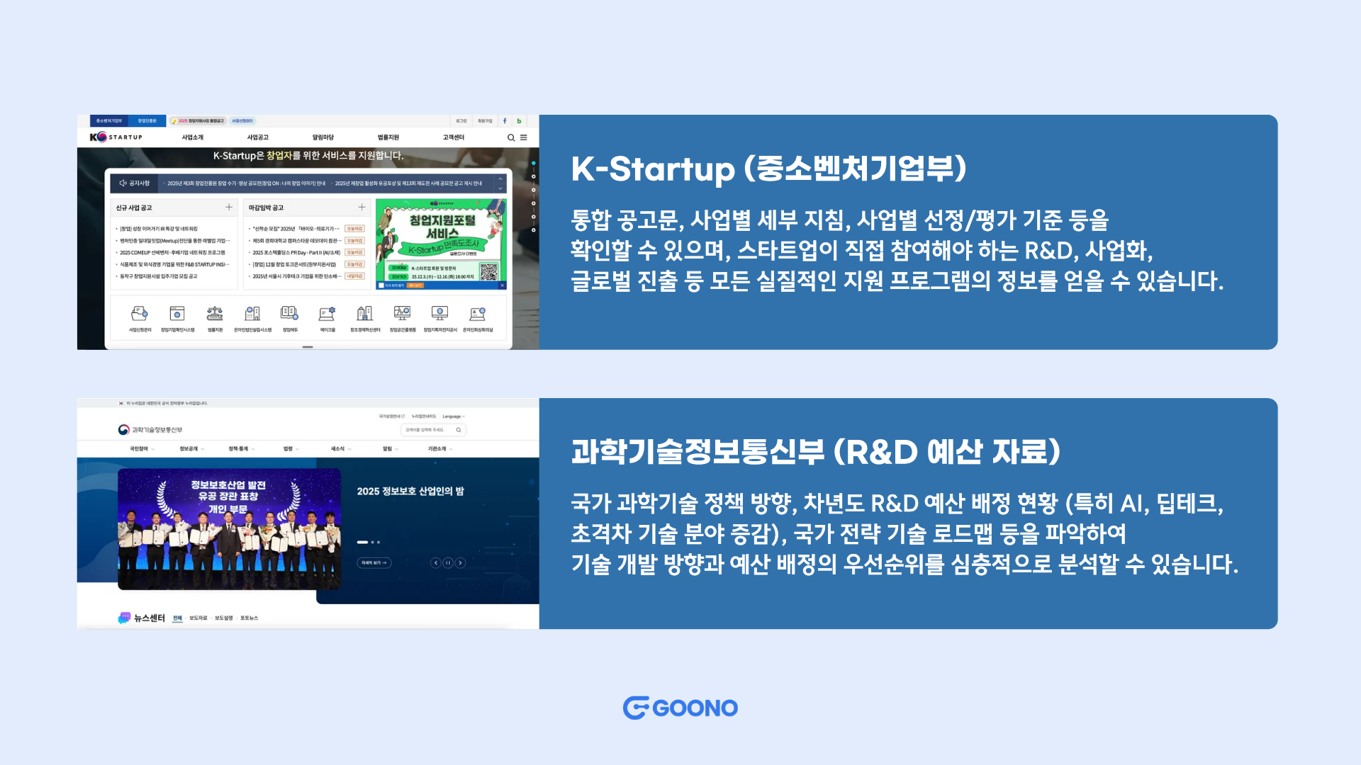 이러한 정부 정책 변화와 예산 트렌드를 가장 정확하게 확인하려면 중소벤처기업부의 K-Startup 포털과 과학기술정보통신부의 정책 및 R&D 예산 자료 등 공식 채널을 주기적으로 확인하는 것이 필수적입니다. 스타트업은 이러한 정부의 '공식적인 신호'를 통해 2026년 지원 사업의 방향을 미리 예측하고 대비할 수 있습니다. |
