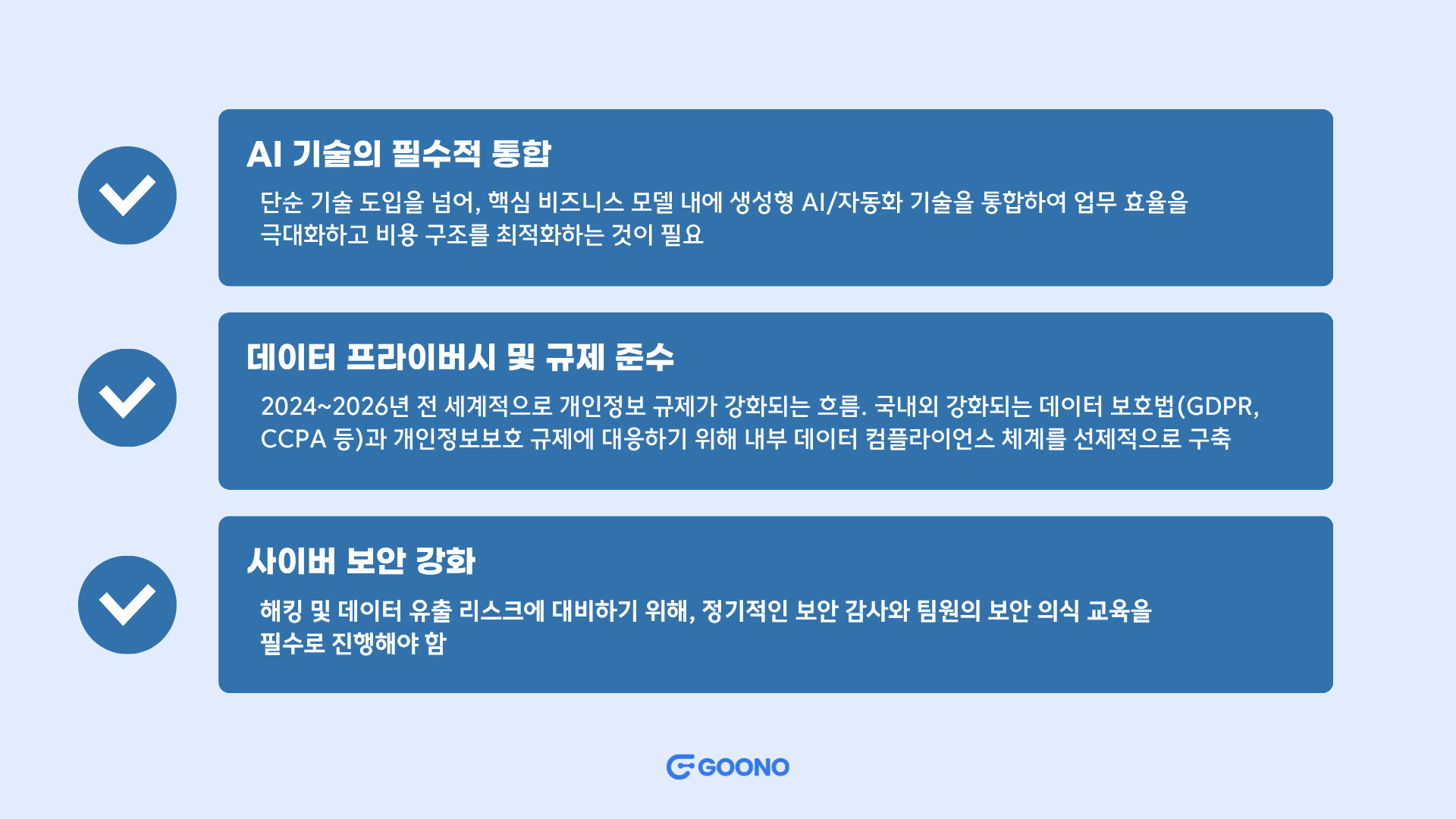 - 데이터 프라이버시 및 규제 준수: 2024~2026년 전 세계적으로 개인정보 규제가 강화되는 흐름을 띄고 있습니다. 국내외 강화되는 데이터 보호법(GDPR, CCPA 등)과 개인정보보호 규제에 대응하기 위해 내부 데이터 컴플라이언스 체계를 선제적으로 구축해야 합니다. 또한 서비스 내 개인정보 및 데이터 처리 절차를 명확히 기록·관리하여 규제 위반 및 분쟁 가능성을 사전에 차단해야 합니다.