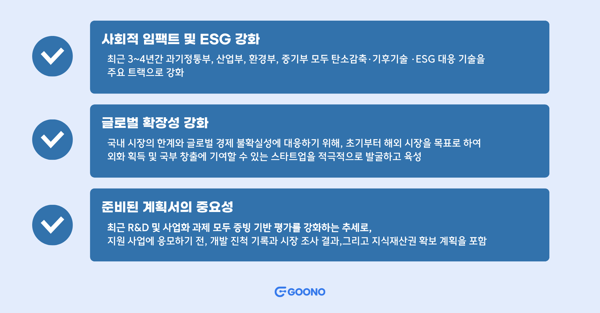 - 사회적 임팩트 및 ESG 강화: 기후 변화 대응과 탄소 중립 목표 달성은 이제 기업의 선택이 아닌 필수 과제가 되었으며, ESG 경영이 기업 가치를 결정하는 핵심 요소임을 인지하고 있습니다. 최근 3~4년간 과기정통부, 산업부, 환경부, 중기부 모두 탄소감축·기후기술·ESG 대응 기술을 주요 트랙으로 강화했습니다. 정부는 환경(E)과 사회(S) 문제 해결에 기여하는 Deep Tech 기반의 솔루션에 정책 자금을 집중하여 국가적인 의무를 이행하고 미래 산업을 육성하려 합니다.