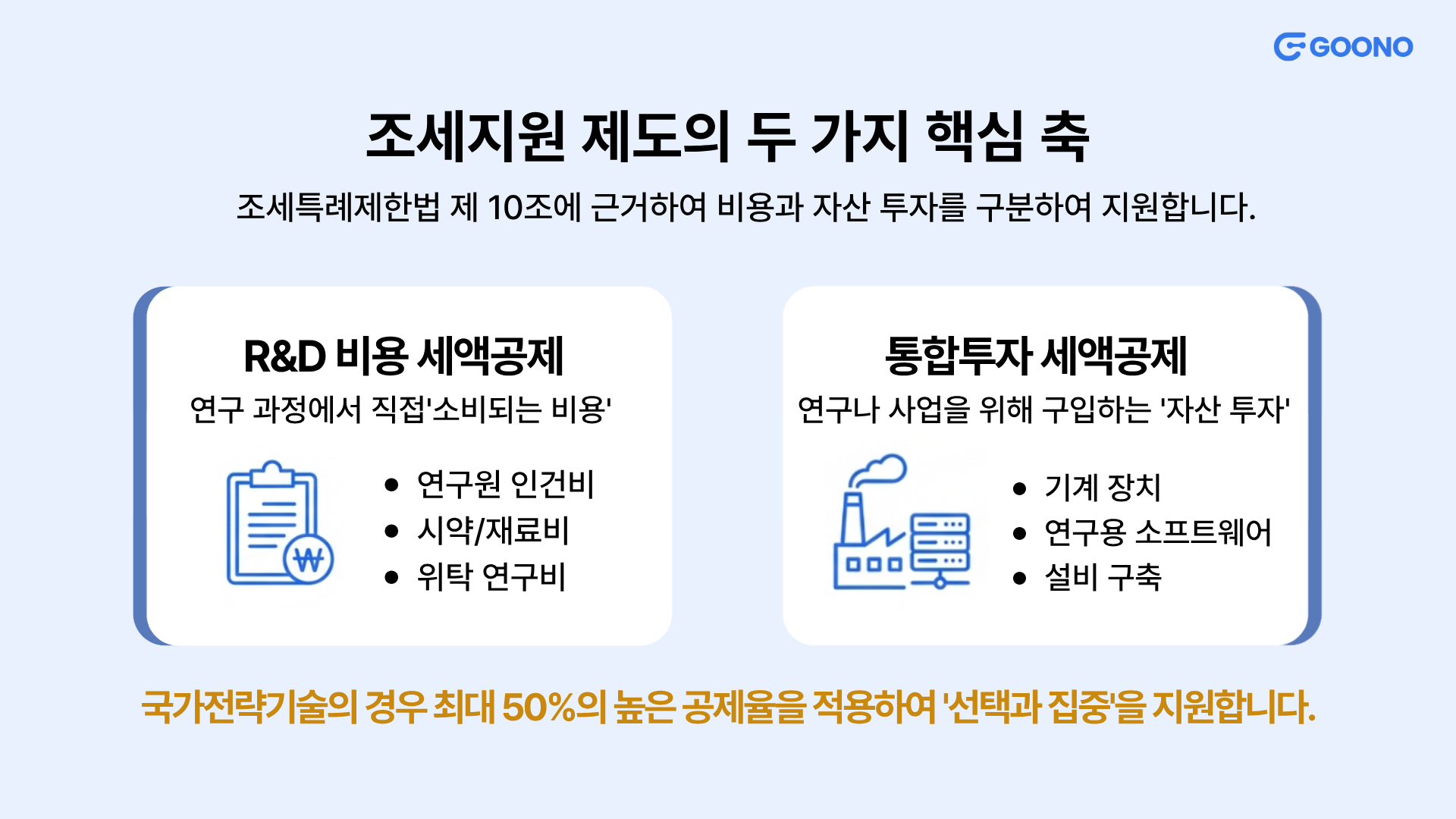 - R&D 비용 세액공제: 연구원의 월급이나 재료비처럼 연구 과정에서 직접 '소비되는 비용'에 대해 공제해 줍니다.