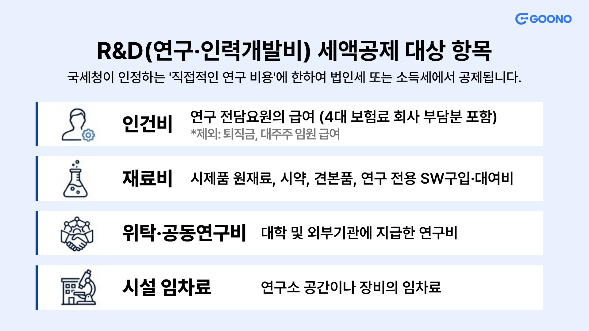 - 인건비: 연구소 또는 전담부서에서 연구 업무에만 전념하는 연구원의 급여. (4대 보험료 회사 부담분 포함, 퇴직금 및 대주주인 임원 급여는 제외)