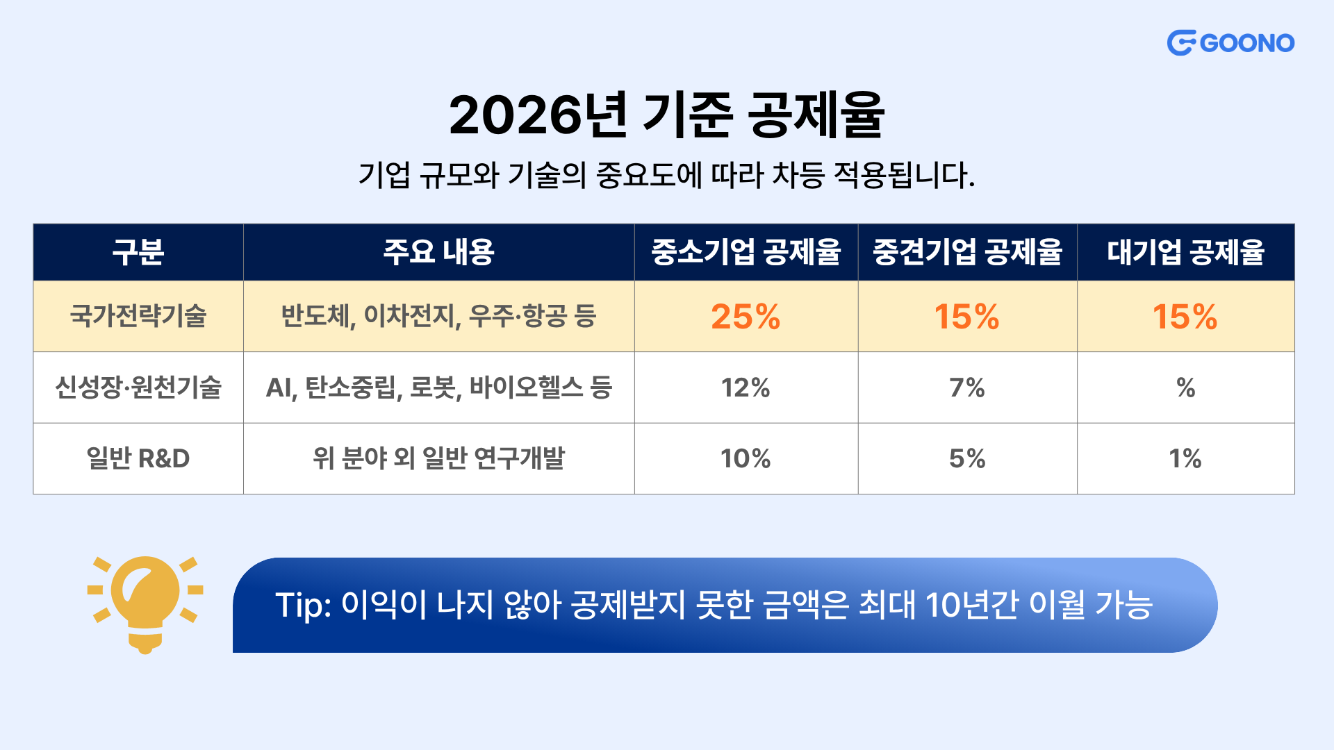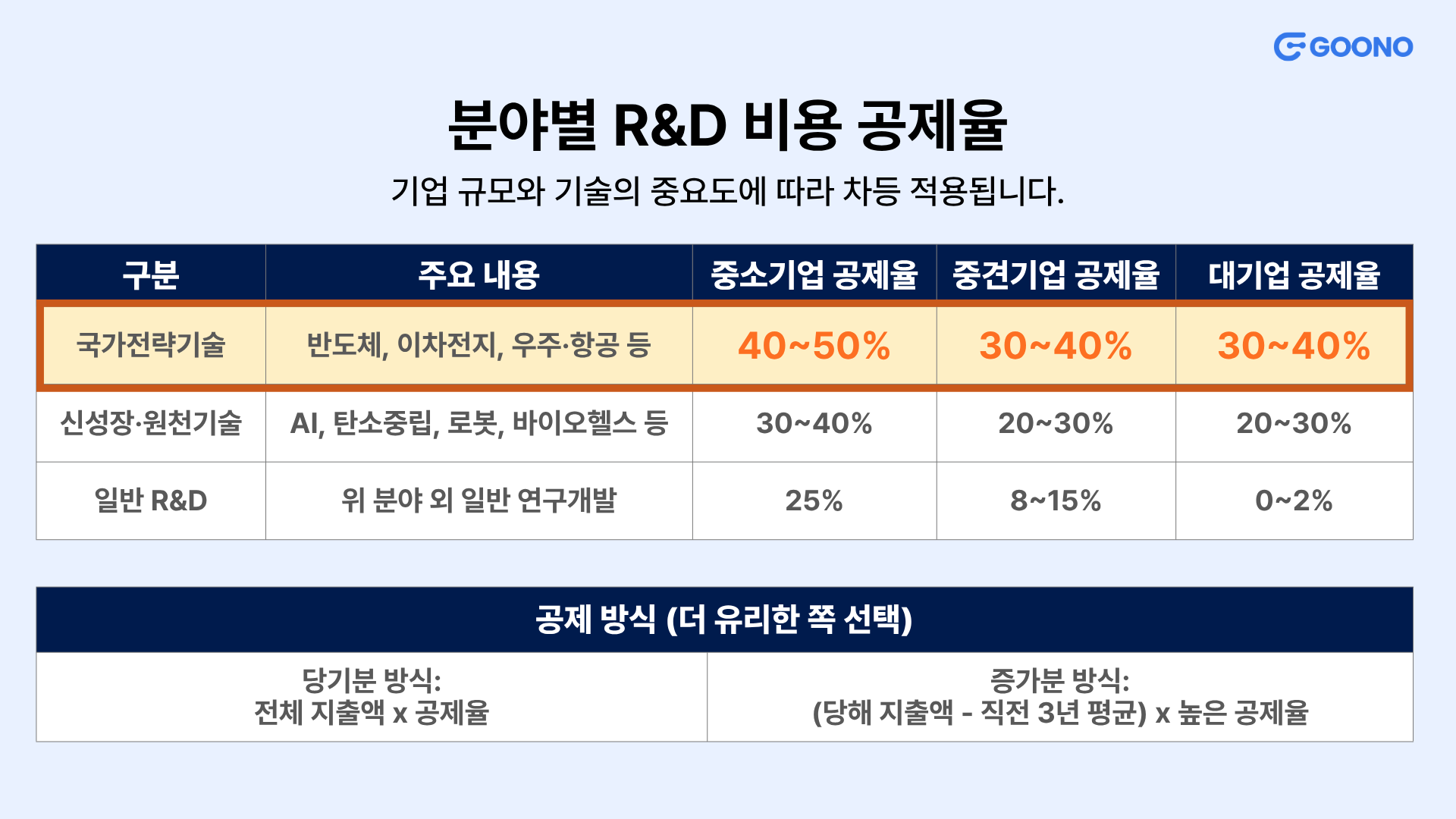 📍참고: 반도체, 이차전지, 백신, 디스플레이, 수소, 우주항공, 차세대 원자력, AI 등의 국가전략기술은 세계 최고 수준의 공제율을 적용받습니다. |