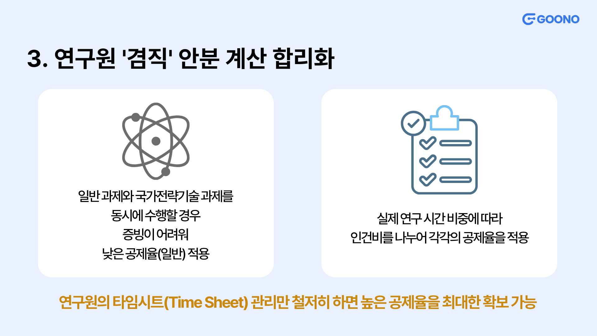 과거에는 연구원이 일반 과제와 국가전략기술 과제를 동시에 수행할 경우 증빙이 어려워 낮은 공제율(일반)을 적용받는 경우가 많았습니다. 그러나 2026년부터는 실제 연구 시간 비중에 따라 인건비를 나누어 각각의 공제율을 적용받는 것이 훨씬 명확해졌습니다. 연구원의 타임시트(Time Sheet) 관리만 철저히 하면 높은 공제율을 최대한 확보할 수 있습니다. |