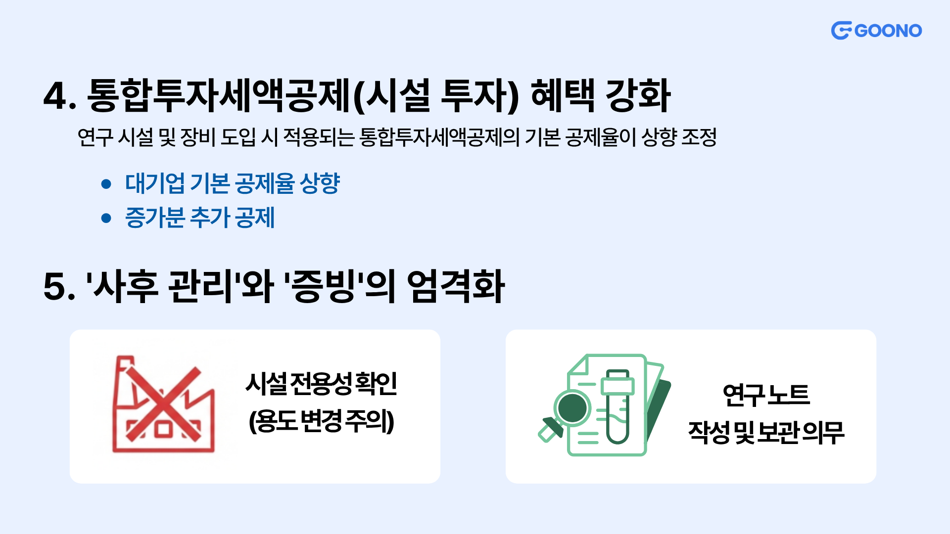 - 연구노트 필수화: 신성장·전략기술 공제를 받는 기업은 연구노트 작성 및 보관이 의무입니다. 이를 소홀히 할 경우 공제받은 세금에 이자까지 더해 추징당할 수 있습니다.