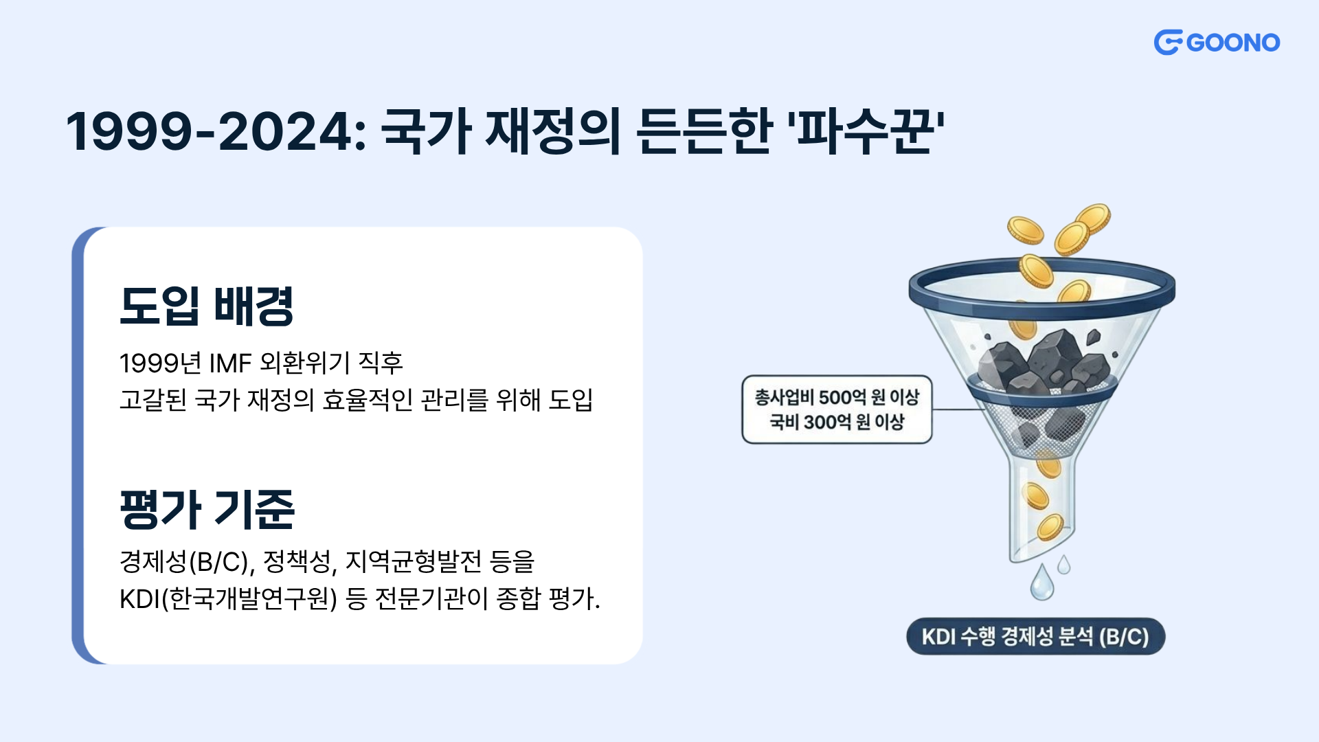 - 도입 배경: 1999년 IMF 외환위기 직후, 바닥난 국가 재정을 효율적으로 관리하기 위해 도입되었습니다. 정치적 압력이나 선심성 공약으로 인해 발생하는 불필요한 대형 공사를 차단하는 강력한 ‘필터’ 역할을 해왔습니다.