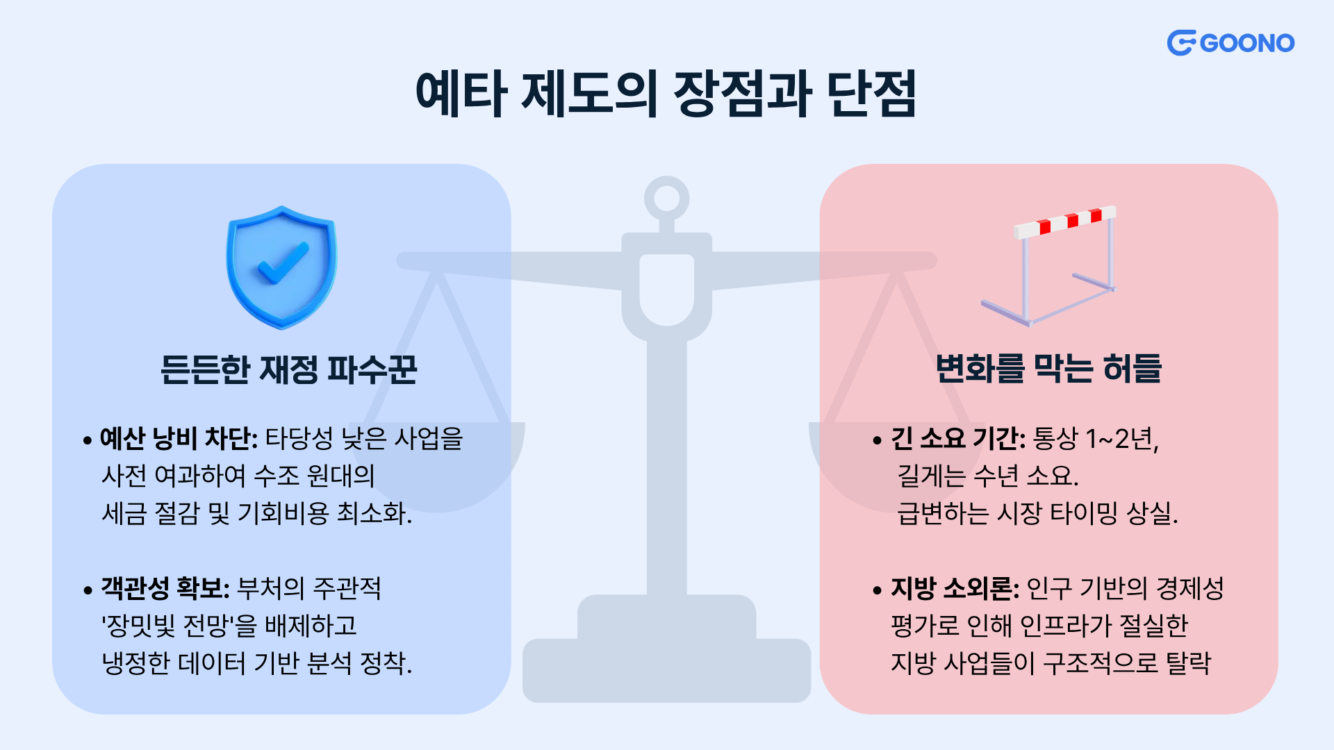 특히 최근 정부는 ‘작고 효율적인 정부’를 지향하며, 불필요한 규제를 철폐하여 민간과 공공의 활력을 불어넣고자 합니다. 예타가 본래의 취지를 넘어 ‘절차를 위한 절차’가 되었다는 인식이 강해진 것입니다. |