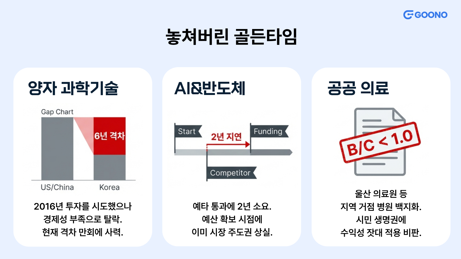 특히 R&D(연구개발) 분야에서 문제가 심각했습니다. AI나 반도체 같은 첨단 분야는 6개월만 늦어도 기술 격차가 크게 벌어지는데, 예타를 받느라 1~2년을 보내면 연구를 시작할 때쯤엔 이미 구식 기술이 되어버리는 ‘적기 실기’ 문제가 치명적이었습니다.