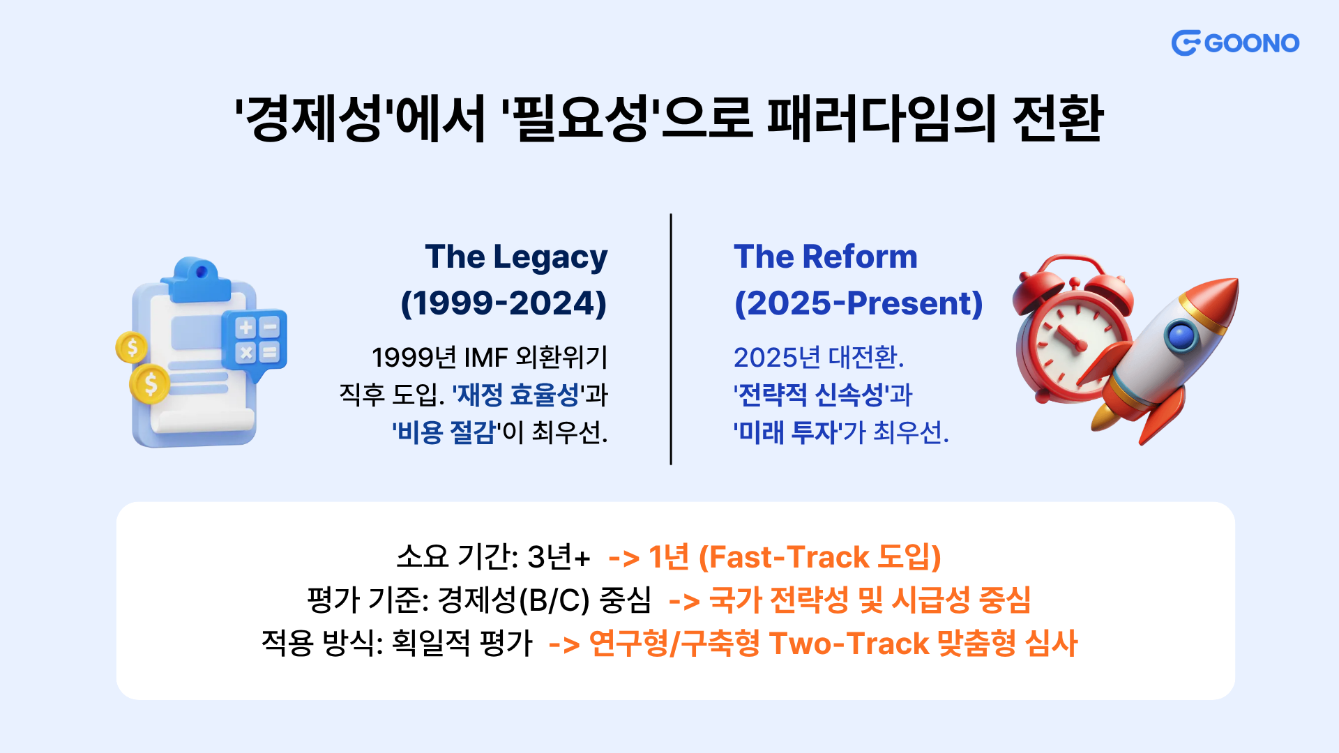 - 핵심 변화: 가장 획기적인 점은 경제성 분석(B/C)의 폐지입니다. 이제는 "돈이 되느냐"보다 "이 연구가 왜 필요한가, 시급한가"를 중심으로 점검합니다.