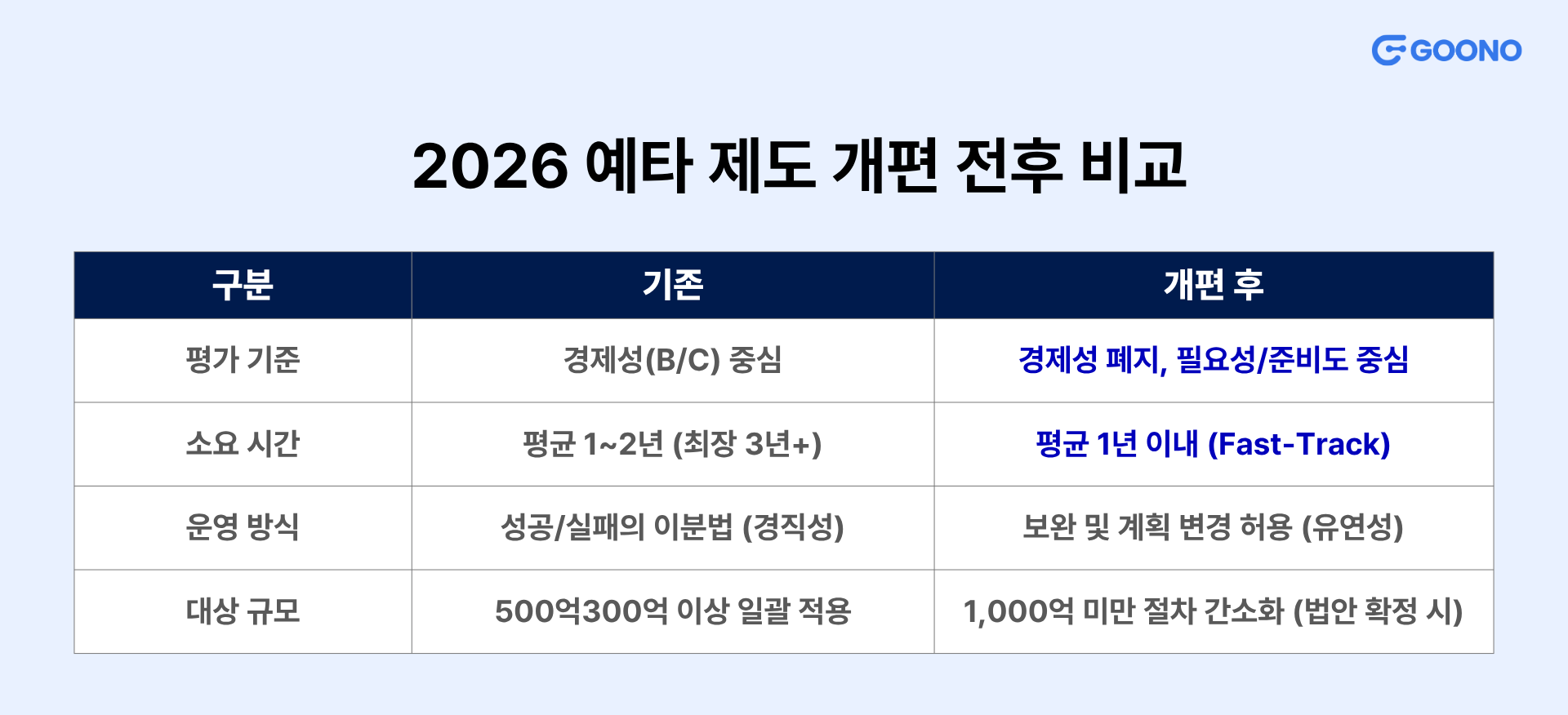 이 개편안을 담은 법안은 작년(2025년) 11월 국회 법사위를 통과했으며, 현재 본회의 통과를 코앞에 두고 있습니다. 법안이 최종 확정되면 1,000억 원 미만 규모의 사업들에 대해서는 예산 편성 단계에서의 절차가 더욱 간소화되어, 그야말로 '속도전'이 가능해질 전망입니다. |