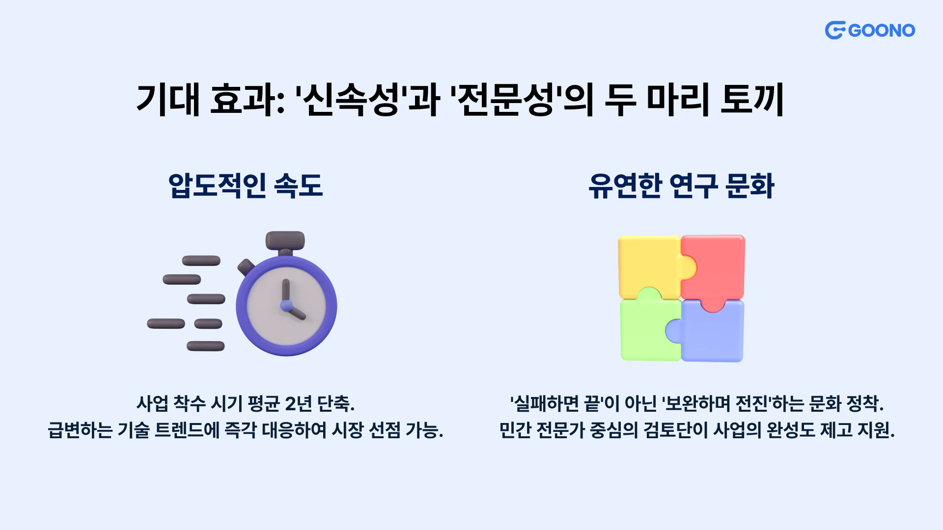 - 압도적인 속도: 연구형 R&D의 경우, 과거보다 사업 착수 시기가 평균 2년 이상 빨라질 것으로 기대됩니다. 이는 글로벌 기술 패권 경쟁에서 '퍼스트 무버'로 도약할 수 있는 발판이 됩니다.