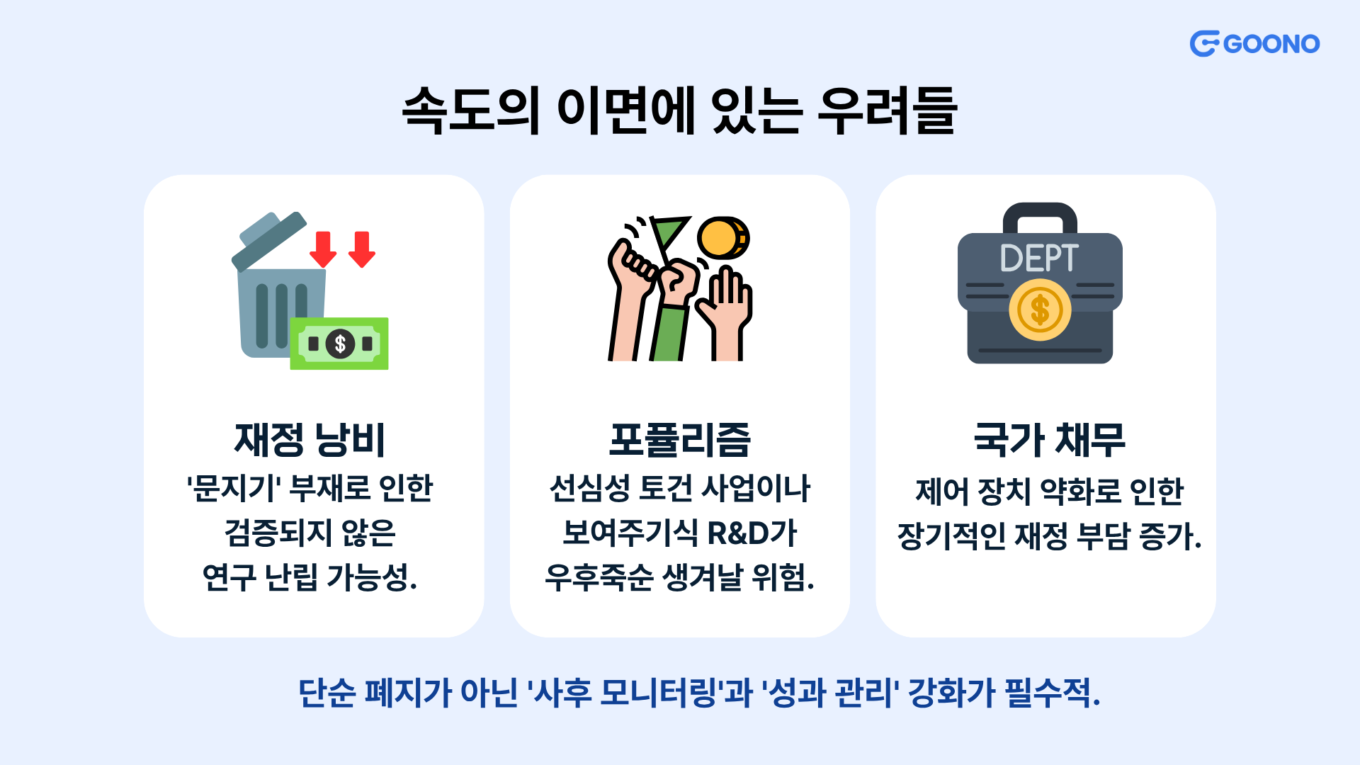 그러나 우려되는 점도 있습니다. ‘문지기’가 사라지면서 선심성 토건 사업이 우후죽순 격으로 생겨나거나, 검증되지 않은 연구에 막대한 예산이 낭비되어 국가 채무가 늘어날 수 있다는 지적이 있습니다. 일명 ‘포퓰리즘 사업’에 대한 제어 장치가 약해질 수 있다는 것이죠.