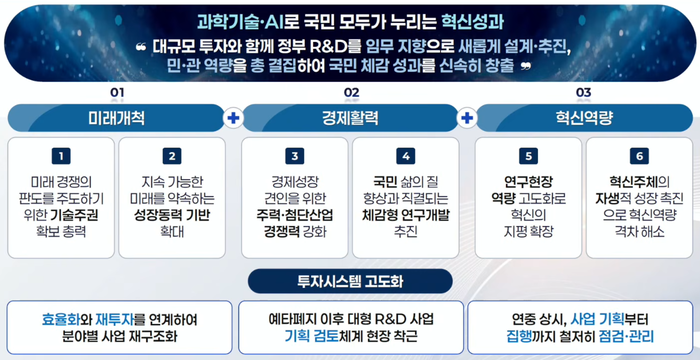 동시에 연구 현장의 혁신을 위해 연구과제중심제도(PBS) 폐지에 따른 출연연의 임무 중심 전환과 인건비 지원 확대를 추진하며, 기초 및 융·복합 연구에 대한 투자를 강화합니다. 또한 예비타당성조사 폐지 이후 대형 R&D 사업의 심의 체계를 조기에 안착시키고, 부처 간 협업을 통해 연구 성과가 신속히 시장으로 연결될 수 있도록 투자 시스템 전반을 고도화할 방침입니다.
