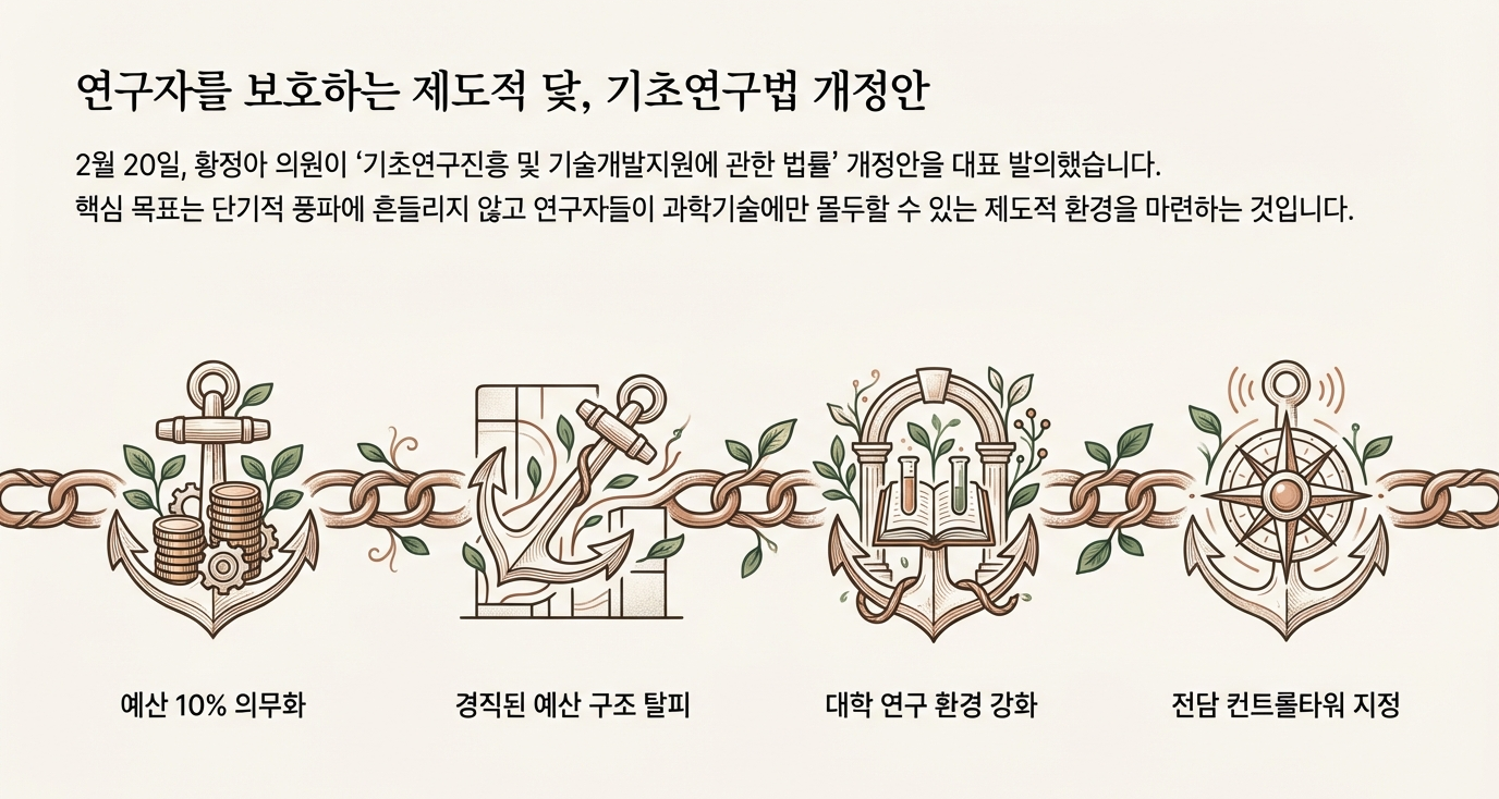 국회에서는 국가 R&D 예산의 10% 이상을 기초연구에 의무적으로 투자하고, 회계연도와 상관없이 연구비 전액을 예산에 반영해 연구 중단을 막는 '기초연구법 개정안'이 발의되었습니다. 이는 과거 예산 삭감으로 위축되었던 연구 현장의 불확실성을 해소하고, 대학의 연구 시설과 인프라를 체계적으로 지원하여 기초연구라는 과학기술의 뿌리를 튼튼히 하려는 입법적 조치입니다.