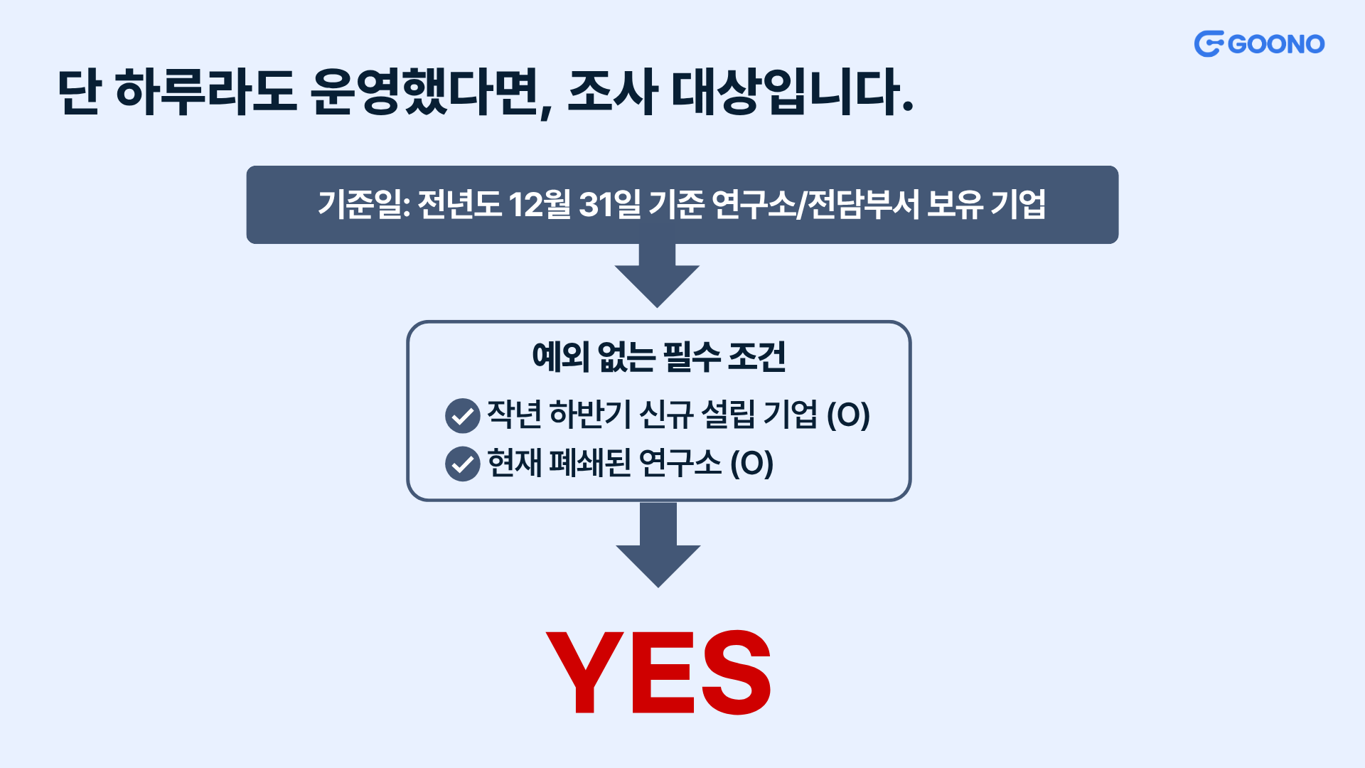 "우리처럼 작은 중소기업도 보고 대상인가요?"라는 질문에 결론부터 말씀드리면, 국가로부터 연구소/전담부서로 인정받은 곳이라면 예외 없이 응답 대상입니다. |