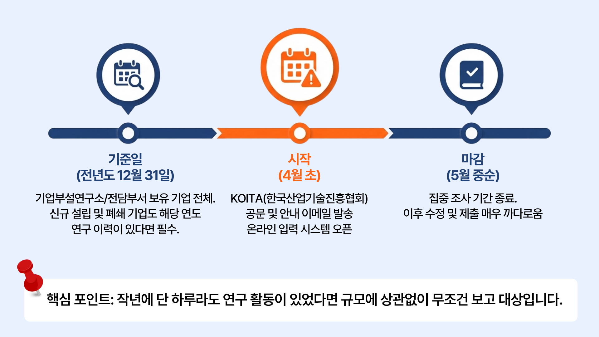 매년 봄이 오면 꽃구경보다 먼저 챙겨야 할 아주 중요한 업무가 있죠. 바로 '연구개발활동조사'입니다. "작년에도 했는데 또 해야 하나?" 싶으시겠지만, 이 조사는 우리 기업과 국가 R&D 정책에 지대한 영향을 미치는 조사랍니다. 이번 뉴스레터에서는 실무자가 꼭 알아야 할 핵심 포인트를 정리했습니다. 그럼 함께 시작해볼까요? |