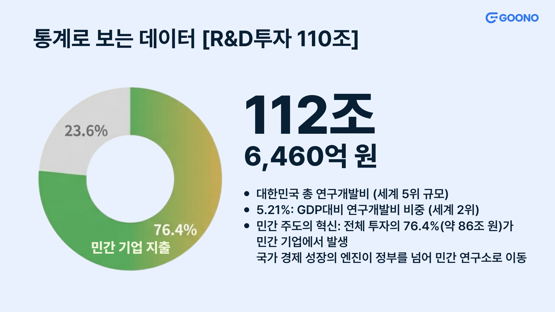 - 주목할 점은 이 중 약 76.4%(약 86조 원)가 민간 기업에서 지출되었다는 것입니다. 이는 우리나라 경제 성장의 엔진이 정부를 넘어 민간 연구소의 혁신으로 옮겨갔음을 의미합니다.