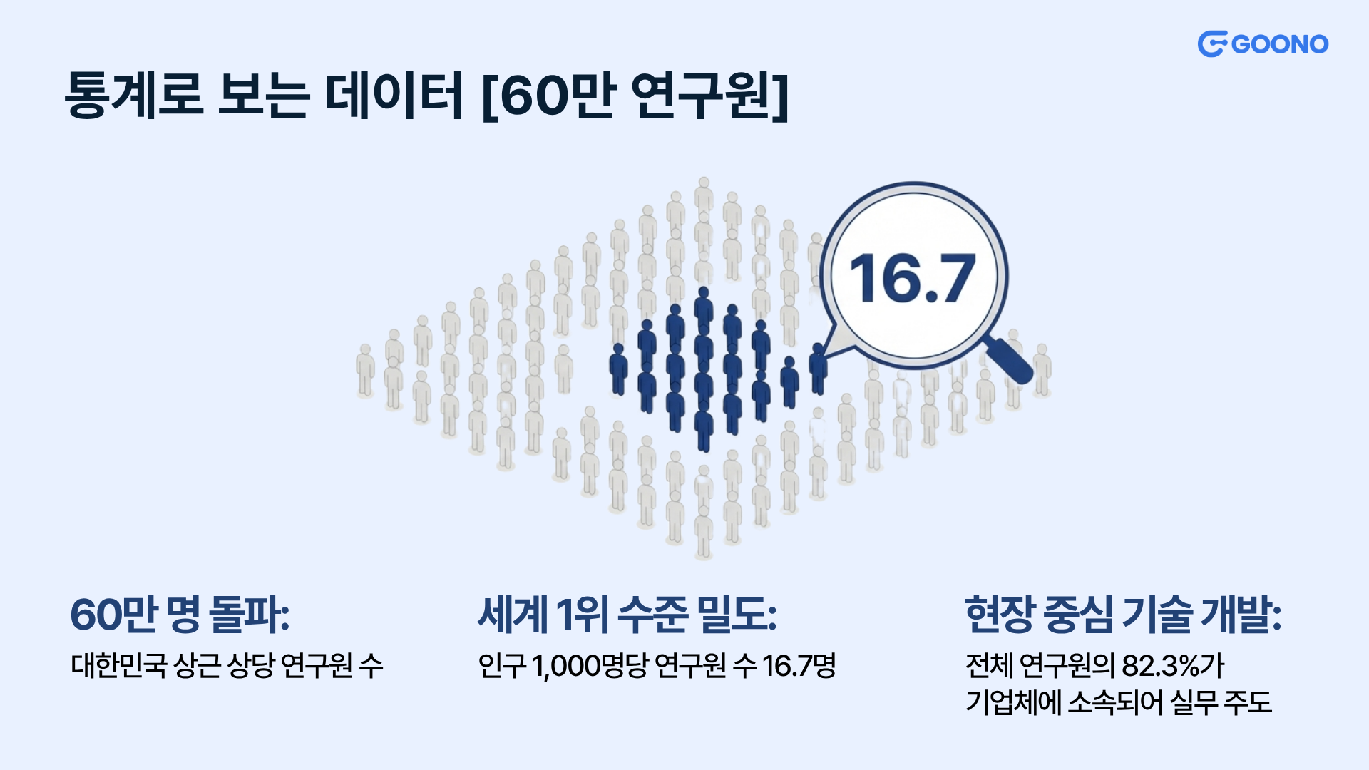 - 양과 질 모두 잡는 '60만 연구원'의 힘: 우리나라에서 활동하는 상근 상당 연구원 수는 약 60만 명을 넘어섰습니다. 인구 1,000명당 연구원 수는 16.7명으로 세계 1위 수준의 밀도를 자랑합니다.