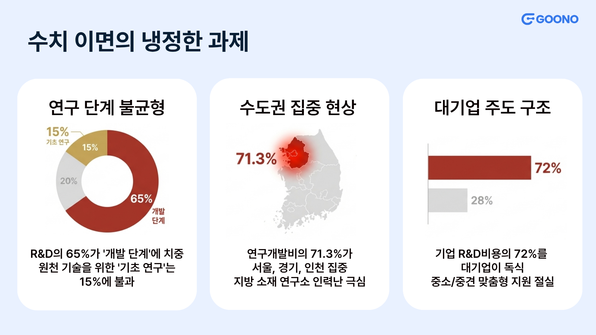 - 수도권 집중 현상: 연구개발비의 약 71.3%가 서울·경기·인천에 집중되어 있습니다. 지방 소재 연구소들이 겪는 인력난과 인프라 부족을 해결하기 위한 지역 특화 R&D 정책이 절실합니다.