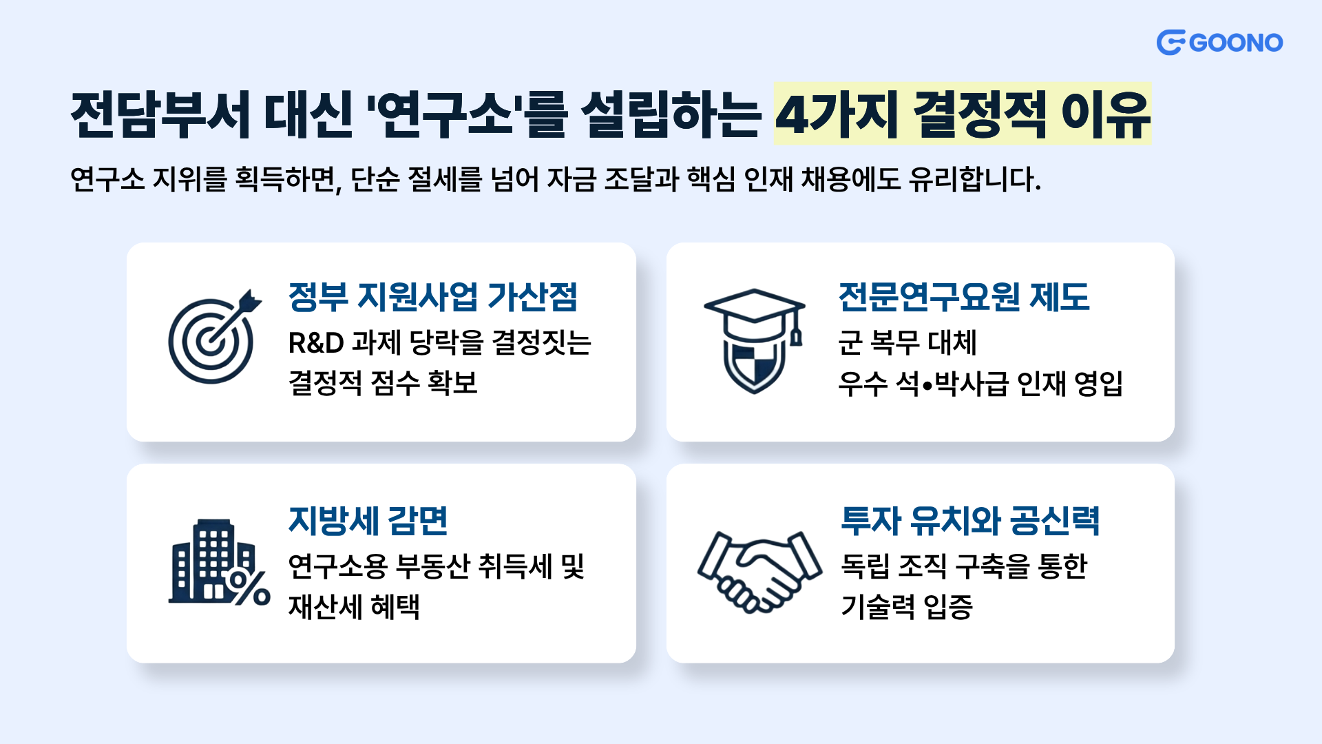 - 병역특례(전문연구요원) 제도 활용: 우수한 석·박사급 인력을 채용하고 싶으신가요? 군 복무 대신 연구소에서 근무하는 '전문연구요원' 제도는 오직 기업부설연구소만 신청할 수 있어요. 인재 영입의 강력한 무기가 됩니다.