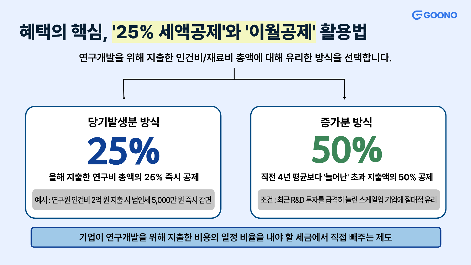 - 증가분 방식 (50% 세액공제): '직전 4년간 평균 발생액'보다 올해 지출이 늘어났다면, 그 증가분의 50%를 공제받을 수 있어요. 25% 공제와 50% 공제 중 우리 회사에 더 유리한 것을 선택하면 됩니다.