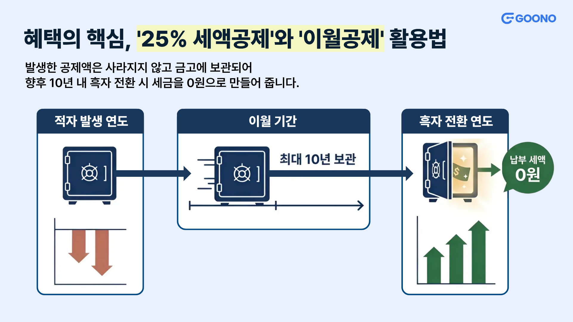 - 10년 이월공제: "지금 당장은 적자라서 낼 세금이 없는데 혜택을 못 받나요?"라고 걱정하지 마세요. 올해 공제받을 세금이 5,000만 원인데 적자가 났다면, 이 금액은 사라지지 않고 향후 10년 동안 그대로 남아있게 됩니다. 나중에 회사가 이익이 나서 세금을 내야 할 때, 과거에 쌓아둔 공제액을 꺼내 써서 세금을 0원으로 만들 수 있는 아주 든든한 장치랍니다.