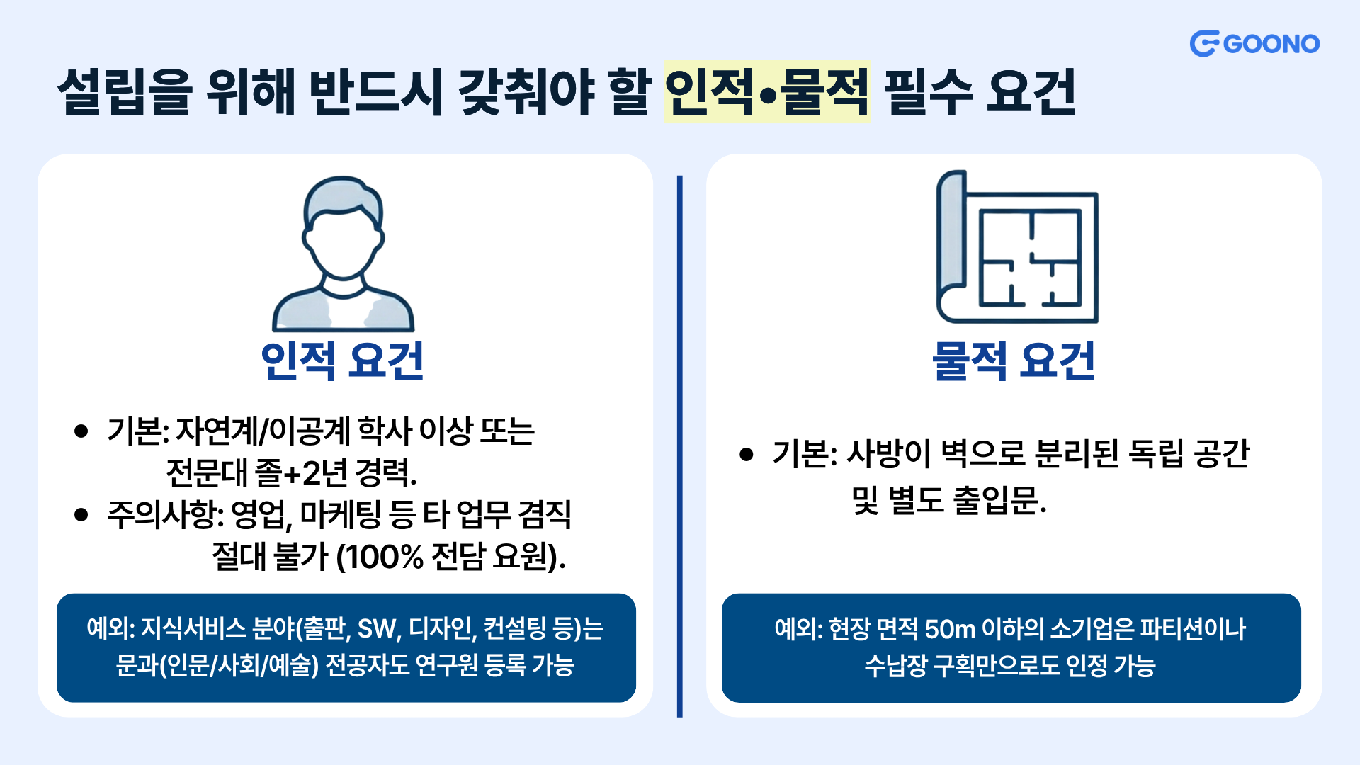 공학 전공자만 연구원을 할 수 있을까요? 최근에는 지식서비스 분야 확대로 문과 계열 전공자도 연구원이 될 수 있습니다. 설립을 위해서는 크게 인적 요건(사람)과 물적 요건(장소)을 충족해야 합니다.
