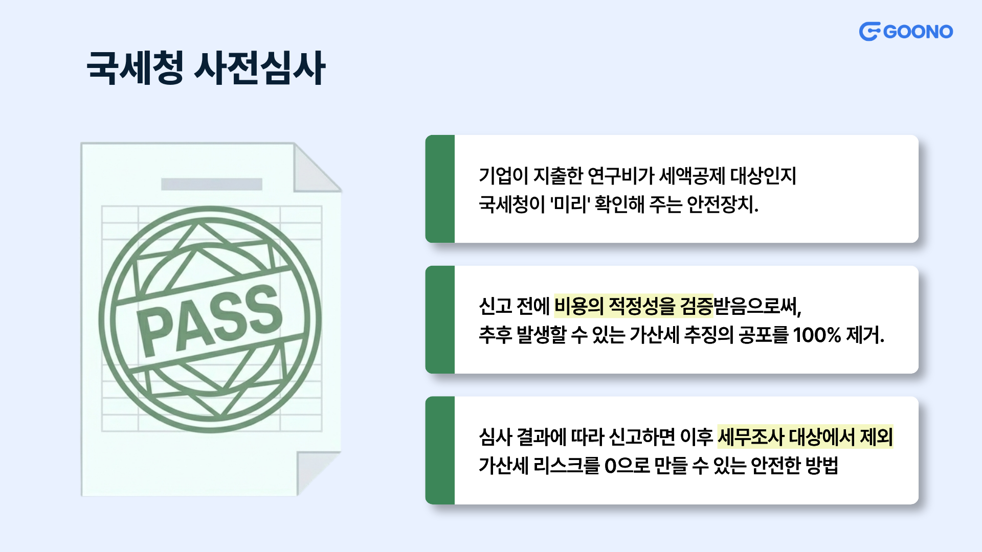 - 어떤 장점이 있나요?: 심사 결과에 따라 신고하면 이후 세무조사 대상에서 제외되는 강력한 혜택이 있어요. 가산세 리스크를 0으로 만들 수 있는 가장 확실하고 안전한 방법이니, 연구소 운영 초기에 꼭 활용해 보시길 추천드려요!