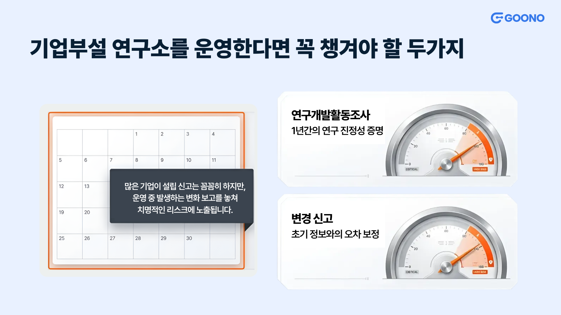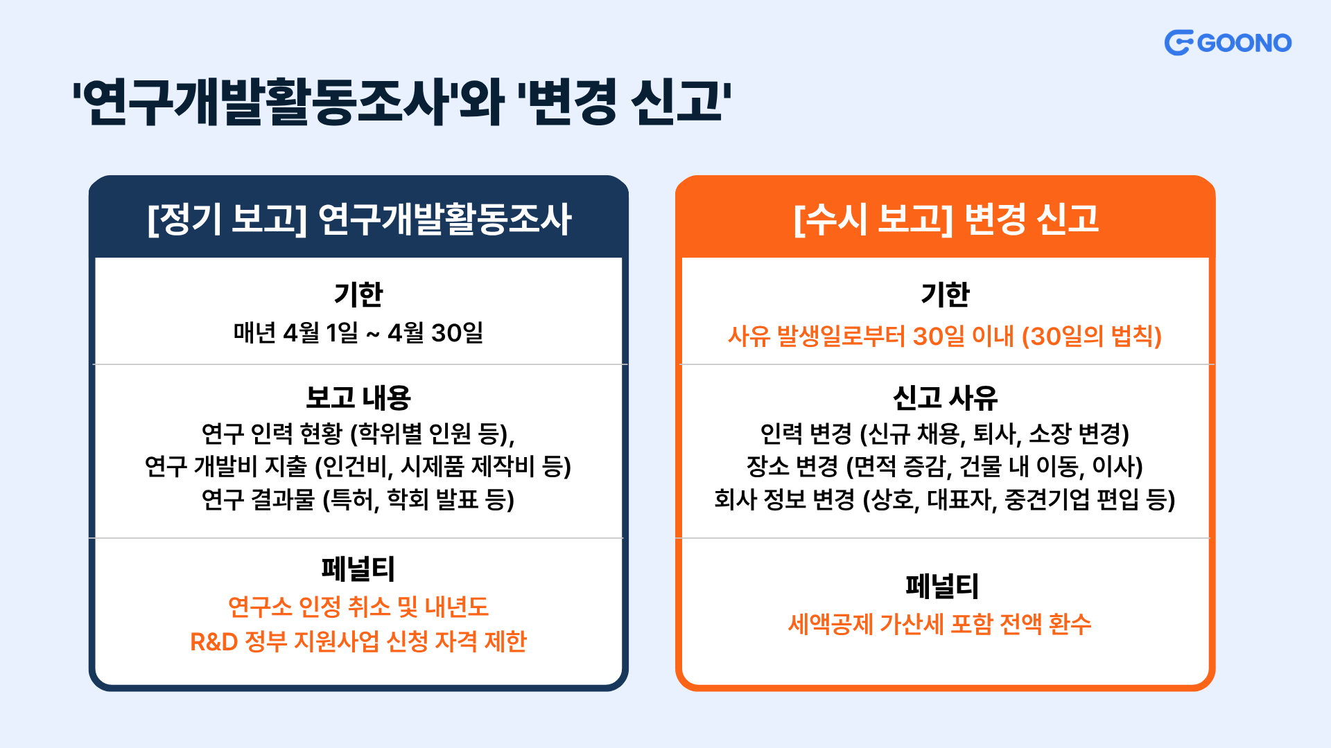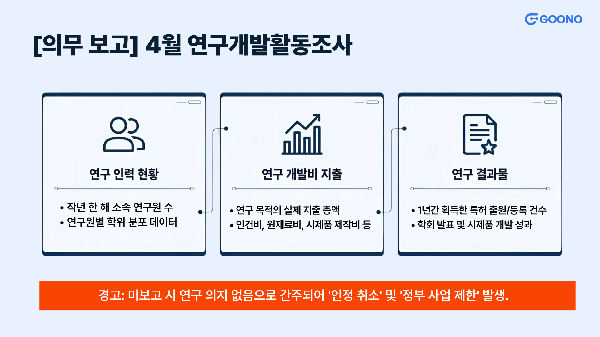왜냐고요? 바로 매년 진행되는 '연구개발활동조사' 보고가 있는 달이기 때문이죠. 또 혹시 그동안 '변경 신고'를 미루고 있었다면, 이번 구노레터를 보고 진행해보시는 건 어떨까요?