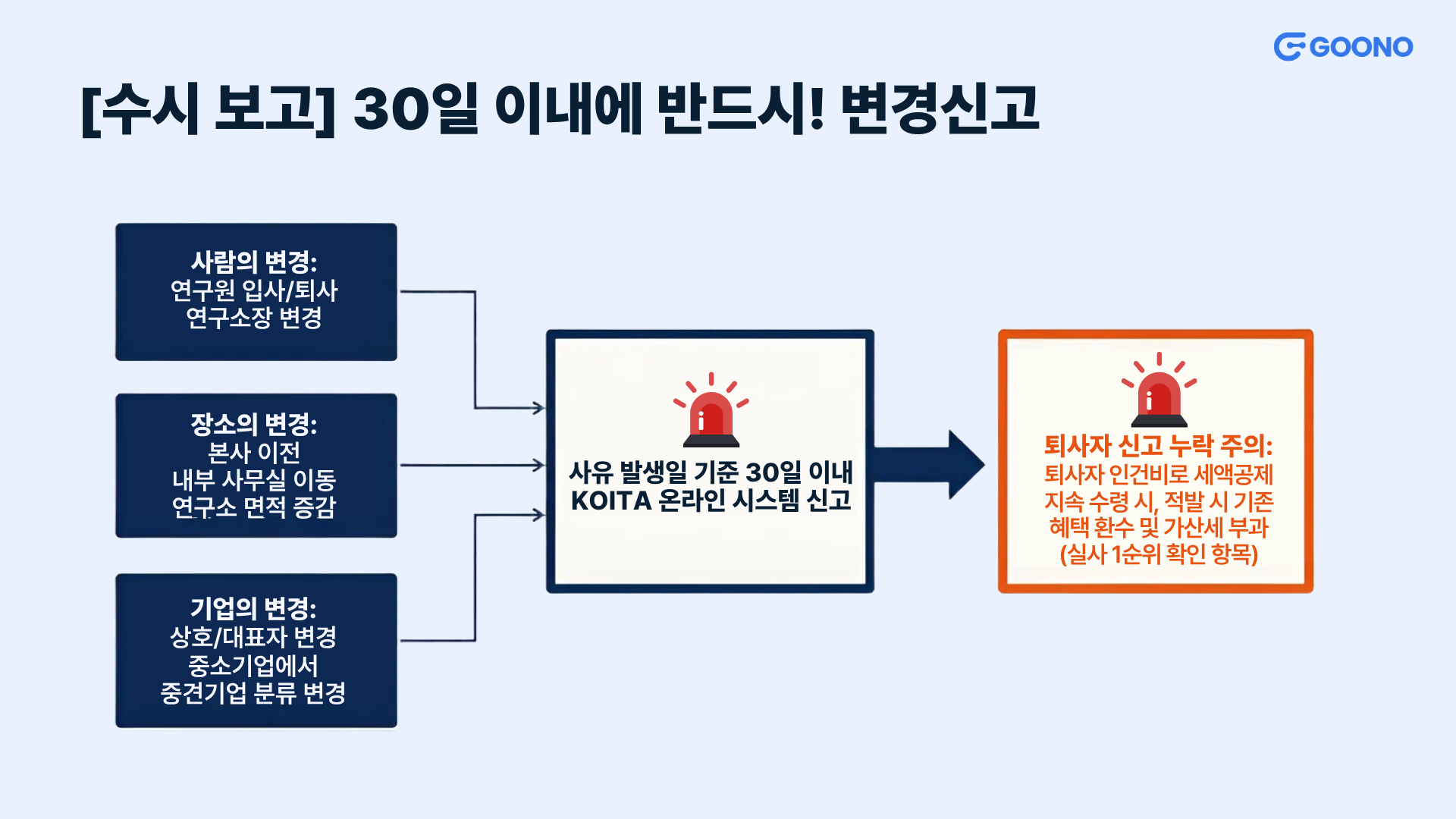 - 신고 기한: 사유가 발생한 날로부터 30일 이내에 KOITA(한국산업기술진흥협회) 온라인 시스템에 신고해야 합니다.