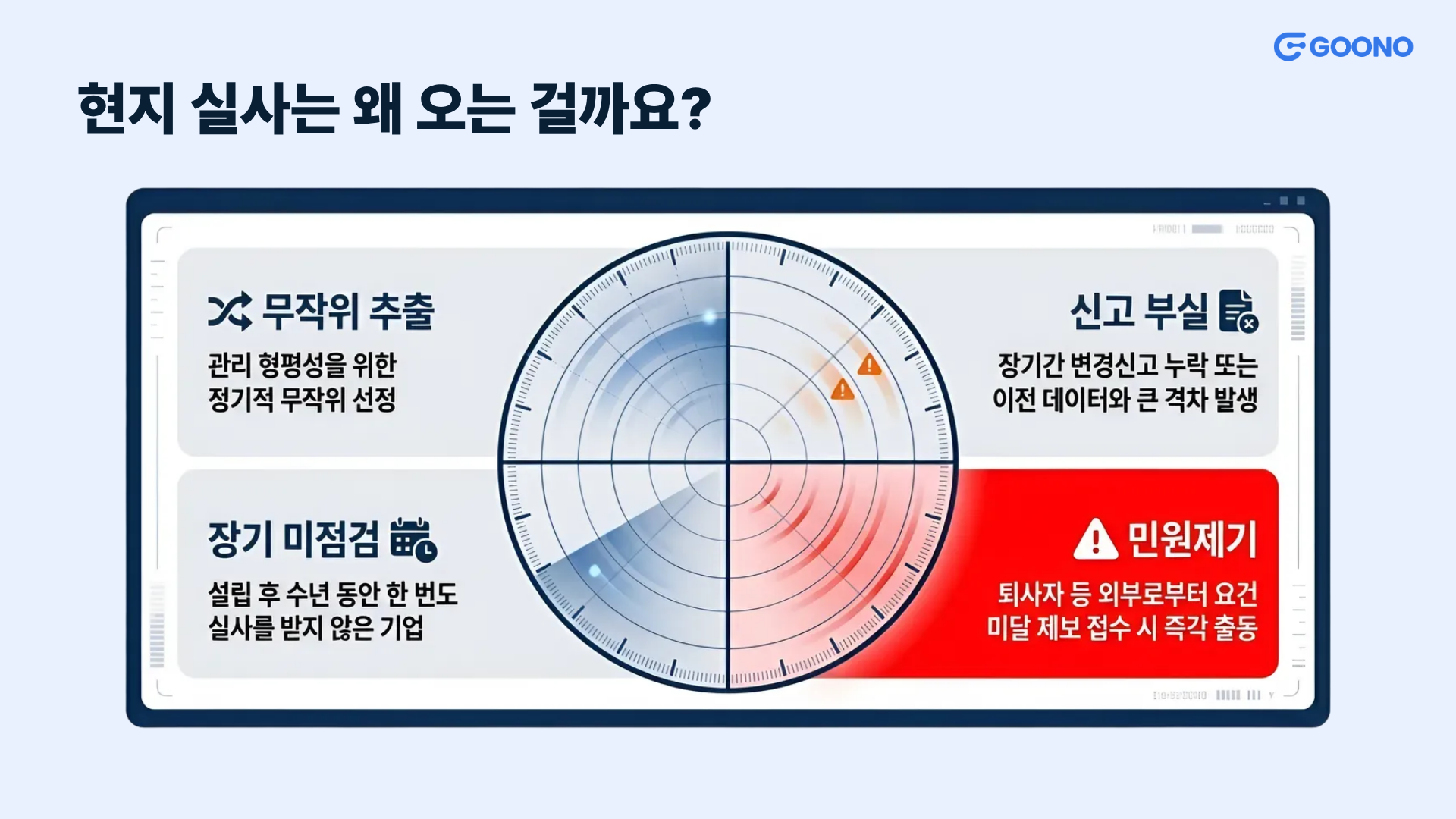 현지 실사는 모든 기업을 대상으로 하지는 않지만, 아래와 같은 경우에 '우선 대상자'가 될 확률이 높습니다.
