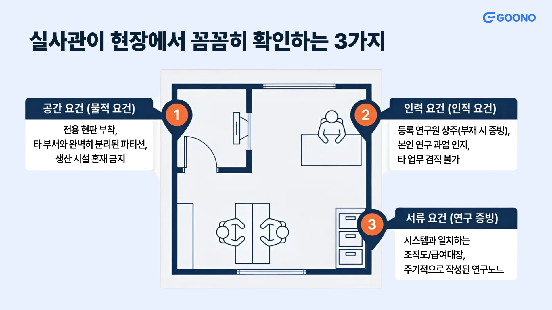 - 등록된 연구원이 실사 당일 연구소 내에 상주하고 있는가? (출장이나 휴가라면 증빙 서류 필요)